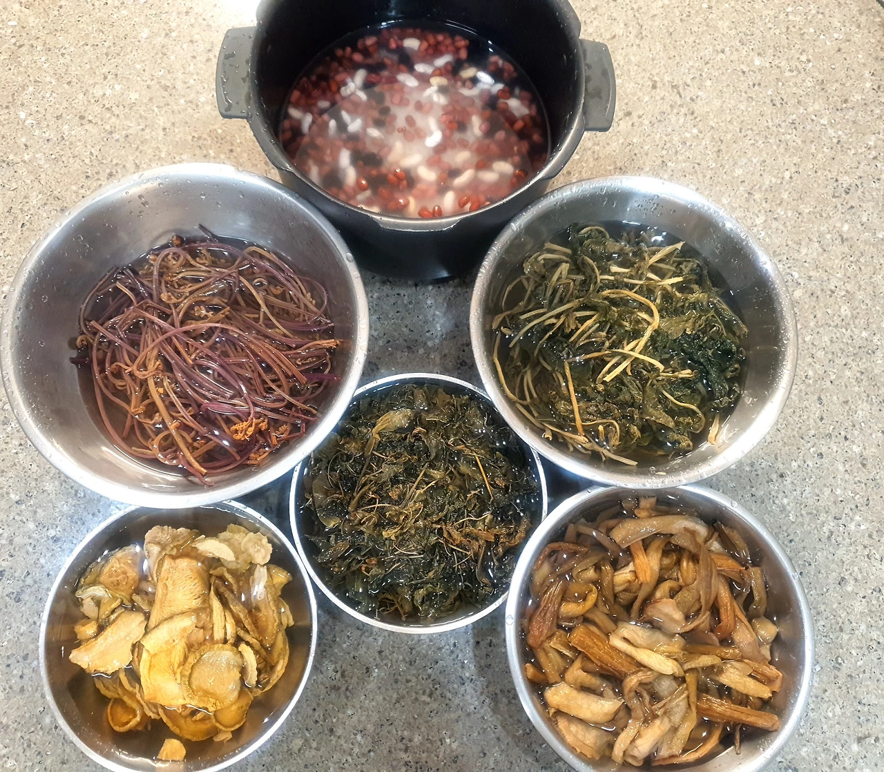 말린 나물은 일단 집에 있다고 해서 바로 먹을 수 있는 게 아니다. 손에 움켜쥐면 바스러질 정도로 말라비틀어진 말린 나물은 일단 끓는 물에 푹 담가 불려주어야 한다. 그렇게 한참을 불렸다가 그 물 그대로 한소끔 푹 끓여서 다시 한참을 풀려주어야 그 부드러우면서도 쫄깃한 식감을 살릴 수 있다. 말린 식재료를 먹기 좋게 재생시키는 데만도 상당한 시간이 필요하다.