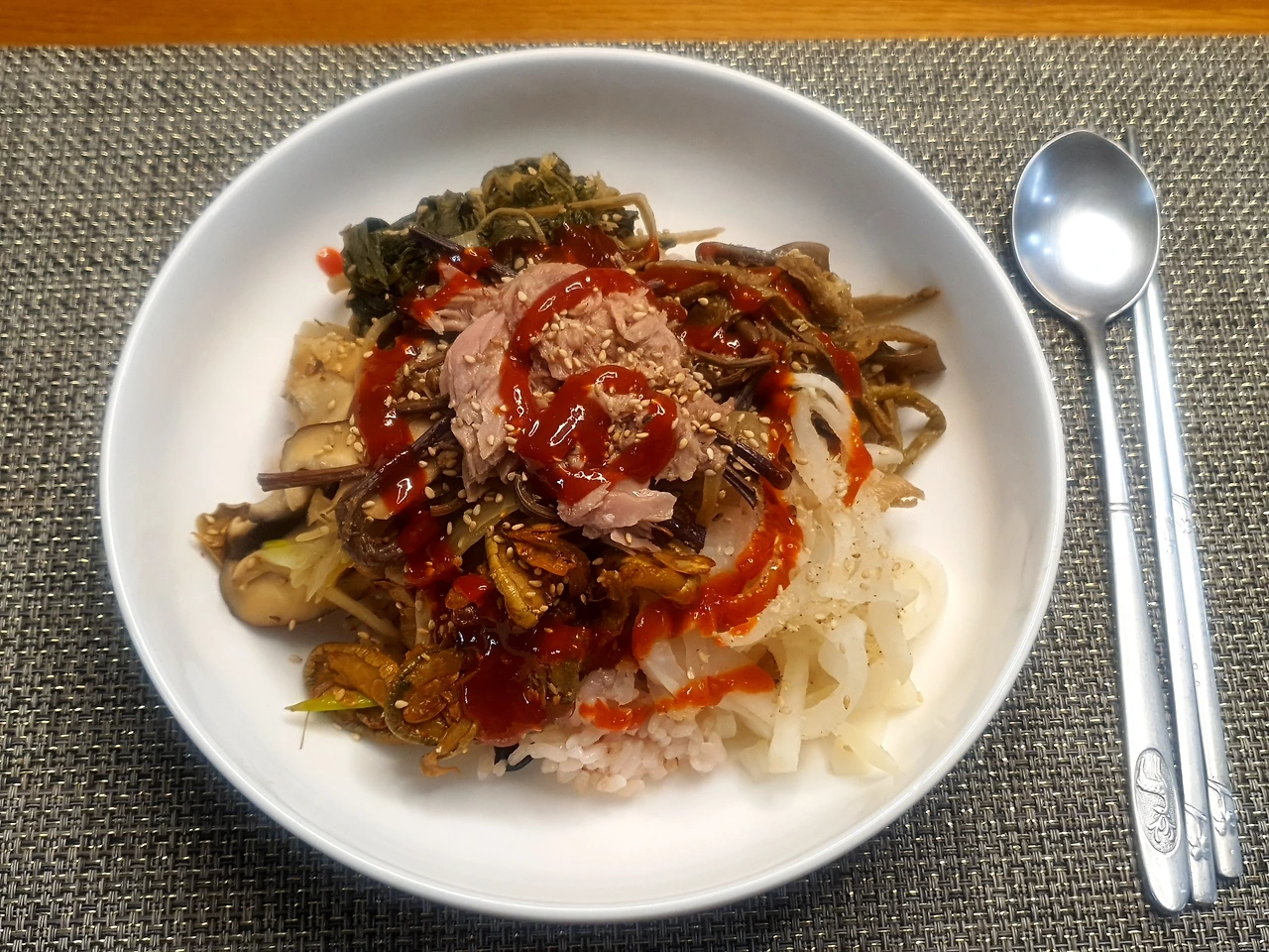 상을 차리기도 전에 축구하고 와서 배고파 죽겠다는 둘째 아들에게 참치캔 하나 따서 고명으로 올리고 나물비빔밥 한 그릇 뚝딱 안겨주었다. 그러다 보니, 된장국 끓일 틈도 없이 하나둘 식탁 앞으로 모여드는 바람에 급하게 나물비빔밥으로 저녁을 마무리했다. 계란프라이 넉넉히 해서 밥 위에 하나씩 올려 고추장에 쓱쓱 비벼서 말이다. 나물만 볶다가 지치는 저녁나절이었다.