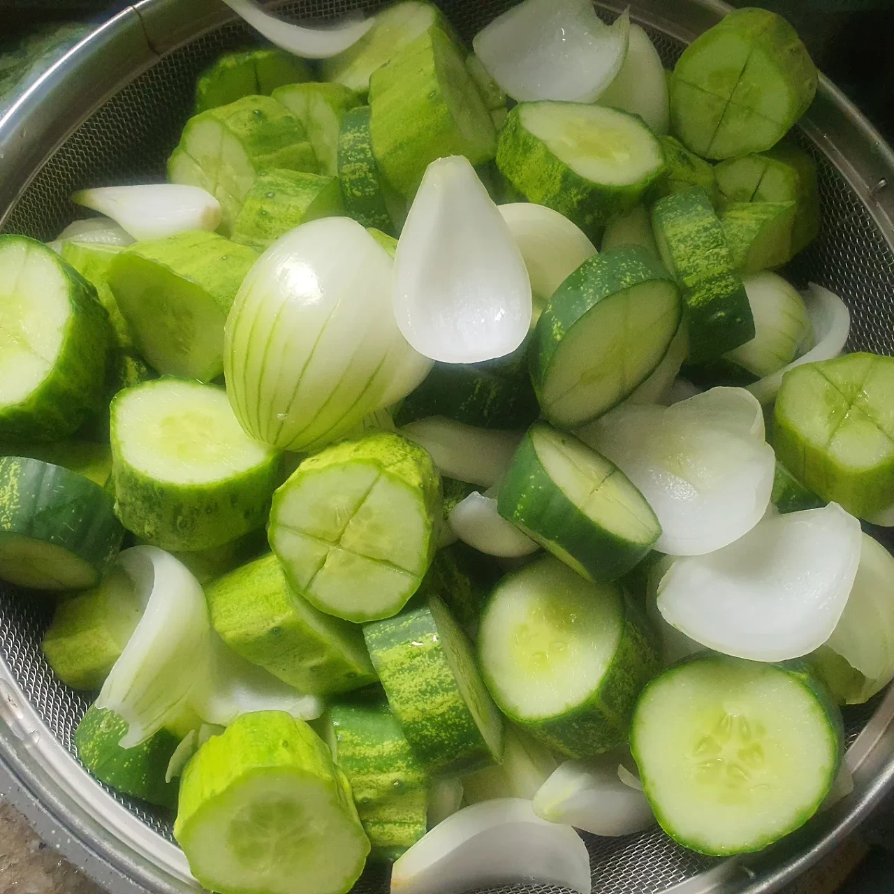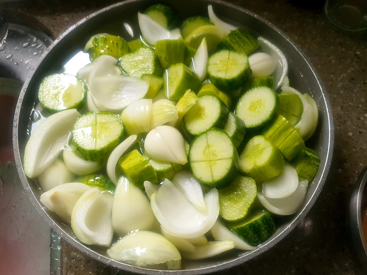여기에 요즘 과일만큼이나 아삭하고 달콤한 양파도 굵게 썰어 오이와 함께 살짝 절여서 준비했다.