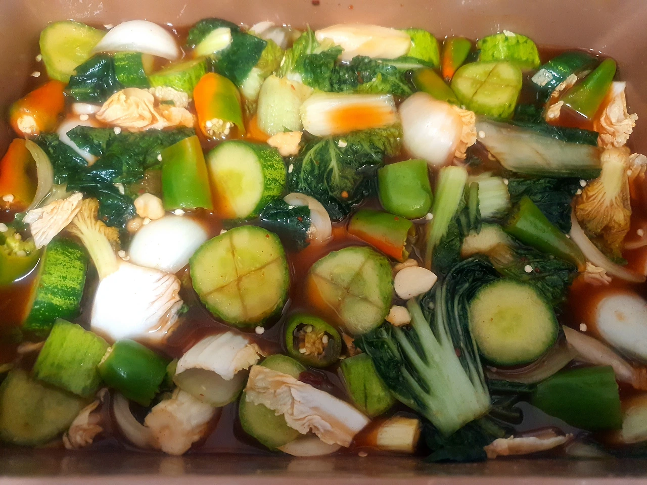 냉장고 속에 뒹굴던 아삭이고추, 쌈배추도 몇 조각 넣었죠!