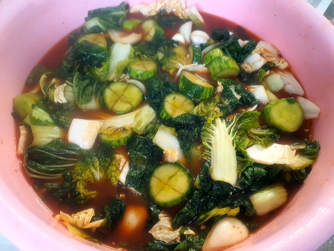 크기도 제법 커지고, 색깔도 진해지고 몸통도 또 튼실해졌다. 한눈에 봐도 제법 억세 진 것 같기도 하다. 그럼에도 불구하고, 또 그 유혹에 빠져들었다. 이번엔 다른 맛을 내보자고 계획도 바꿨다. 평소에 먹던 김치가 아니라 물김치로 변신!!