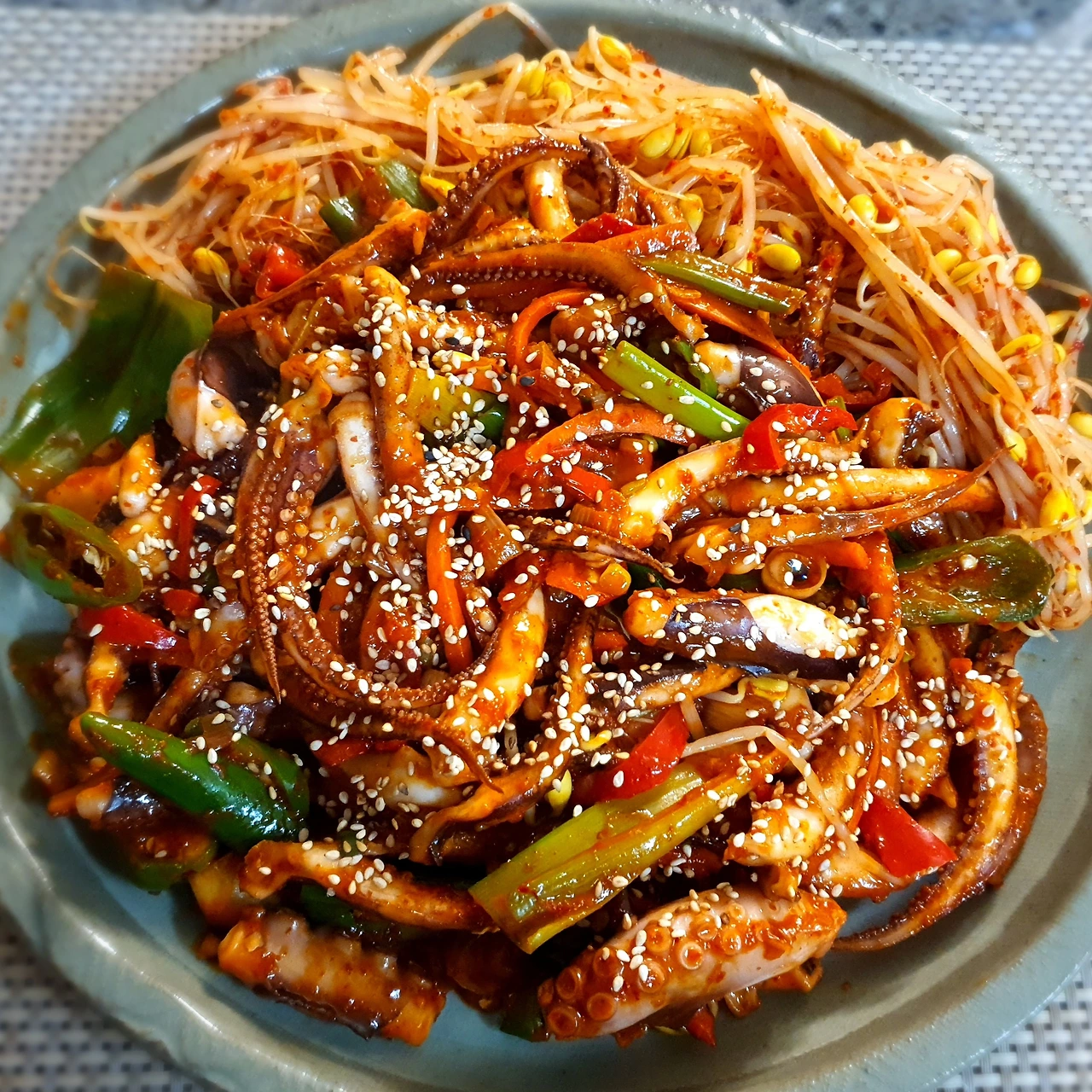 그래서 오늘은 나를 위한 요리다. 매콤하게 입맛 돋구어주는 그 칼칼한 맛을 위해 낙지볶음을 만든다. 몸통만 먼저 먹고 냉동실에 얼려둔 오징어 다리도 함께 섞어 본다. 먼저 살짝 데쳐서 낙지와 오징어를 준비한다. 그래야 국물이 흥건하지 않은 뽀득한 낙지볶음을 만들 수 있다. 들기름 살짝 두르고, 맛난 양념장에 머무려 둔 낙지와 각종 신선한 야채를 빠른 시간안에 번개불에 콩궈먹듯 재빠르게 볶아 내야 한다. 그래야 낙지의 통통함도 야채들의 파릇함도 살려낼 수 있다. 콩나물은 따로 삶아서 찬물에 행궈 아삭하게 무쳤다.