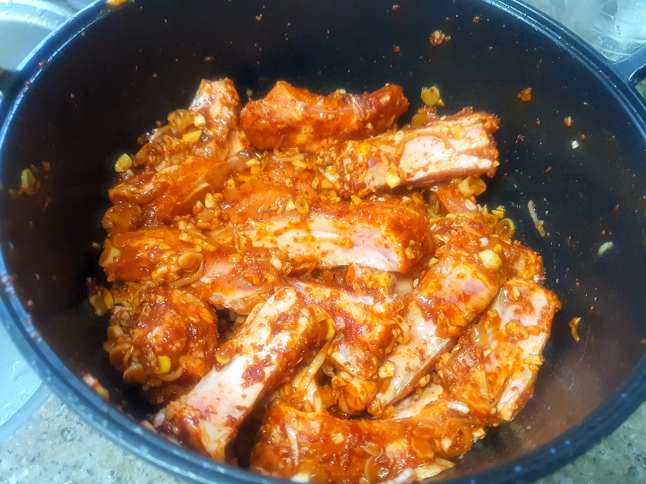 먼저 준비한 등갈비를 갖은양념에 잘 버무려둔다.
