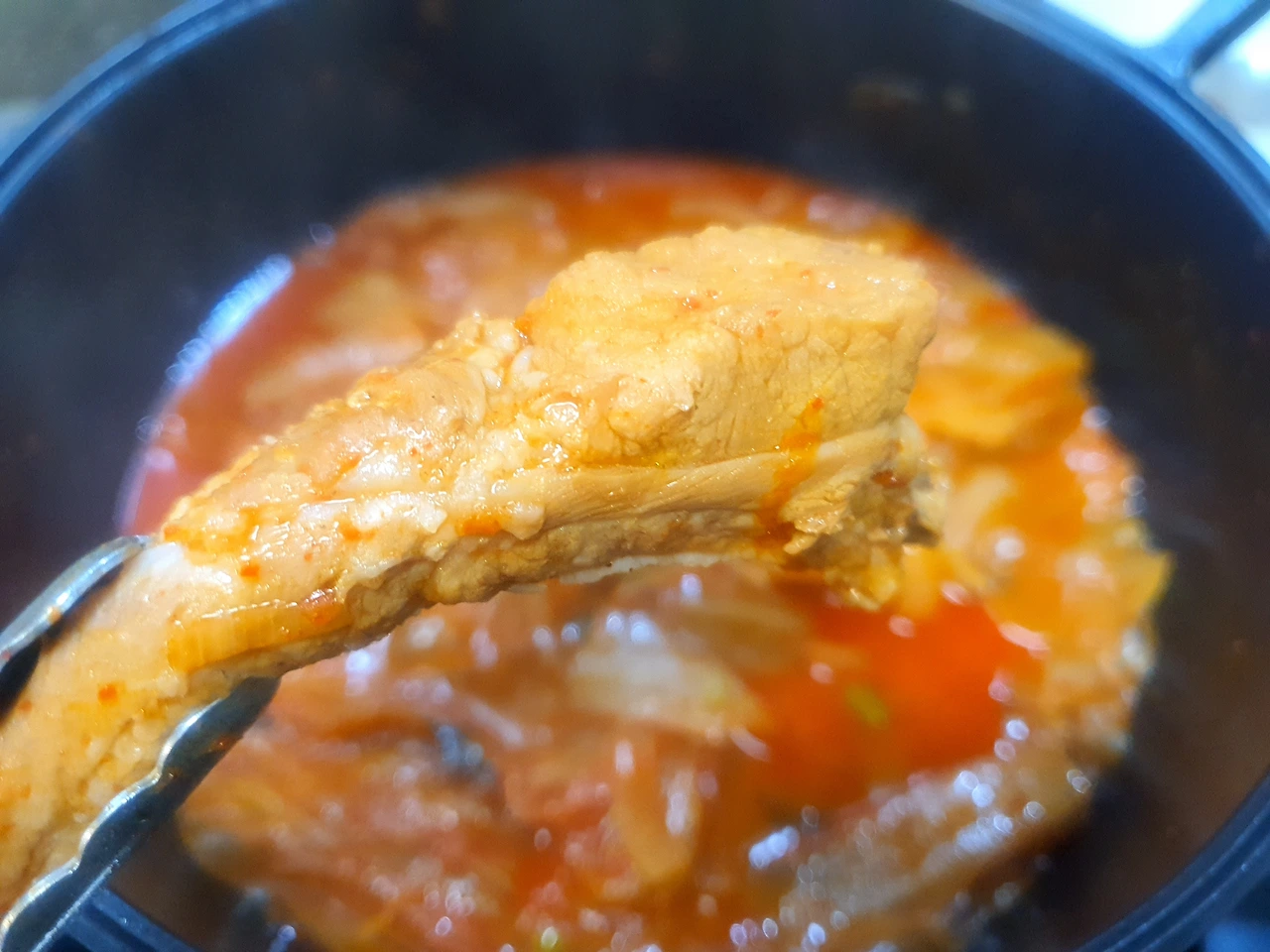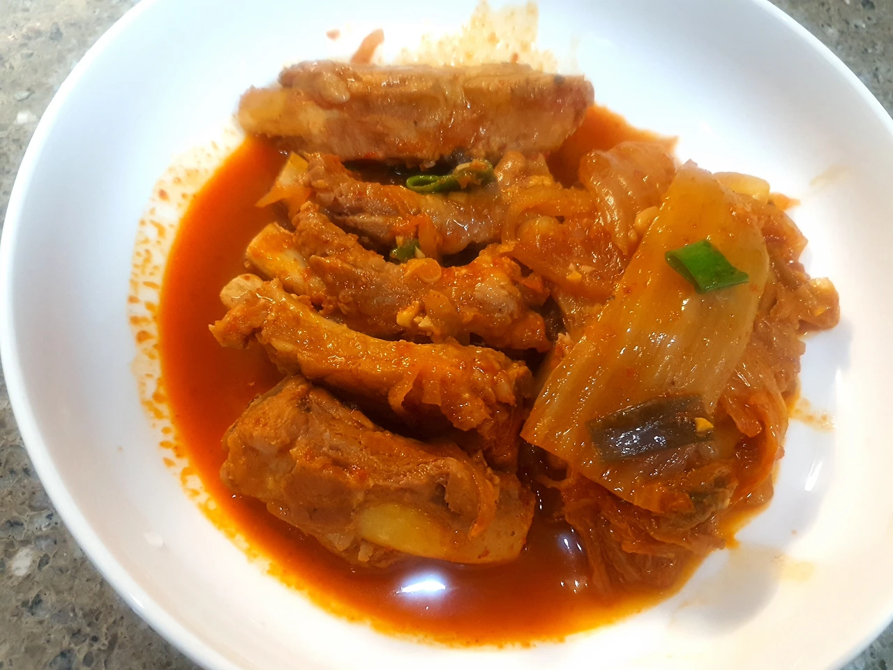 묵은지등갈비찜을 할 때 아쉬운 점은, 너무 발골기술이 뛰어나신 전문가들이 많아, 갈비에 살점이 얼마 안 붙어 있다는 것이다. 실제로 발라 먹을 게 없다는 아쉬움! 맛은 있지만 가성비를 따져 나는 주로 돼지갈비찜용 고기를 주로 사용한다. 하지만 등갈비는 찜용 돼지갈비에 비해 익히는데 시간도 많이 안 걸리고, 맛도 훨씬 좋은 것은 부정할 수 없는 사실이다. ㅎㅎ