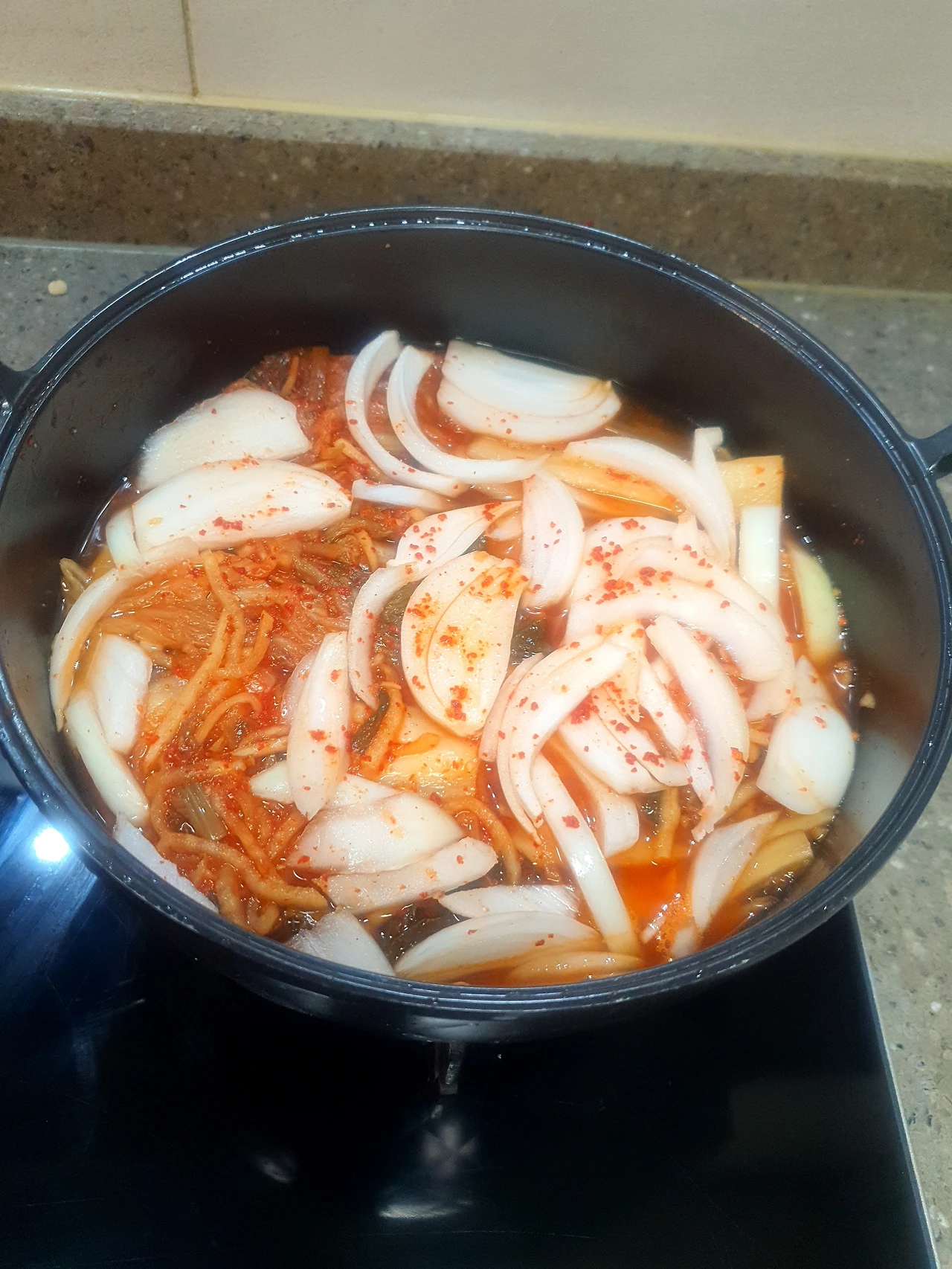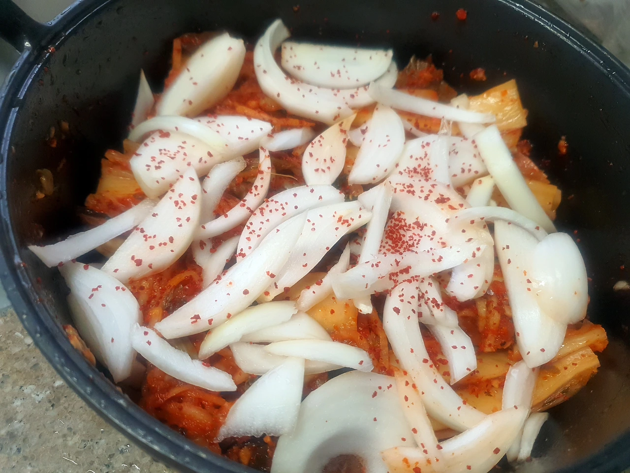 양파와 대파를 굵게 썰어 김치 위에 보기 좋게 올린다.