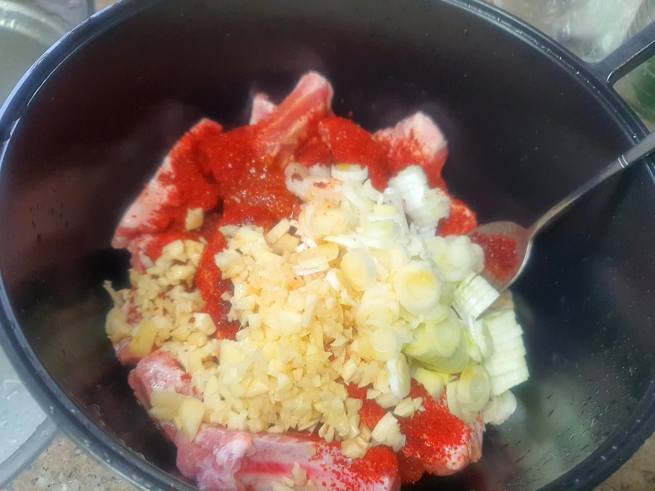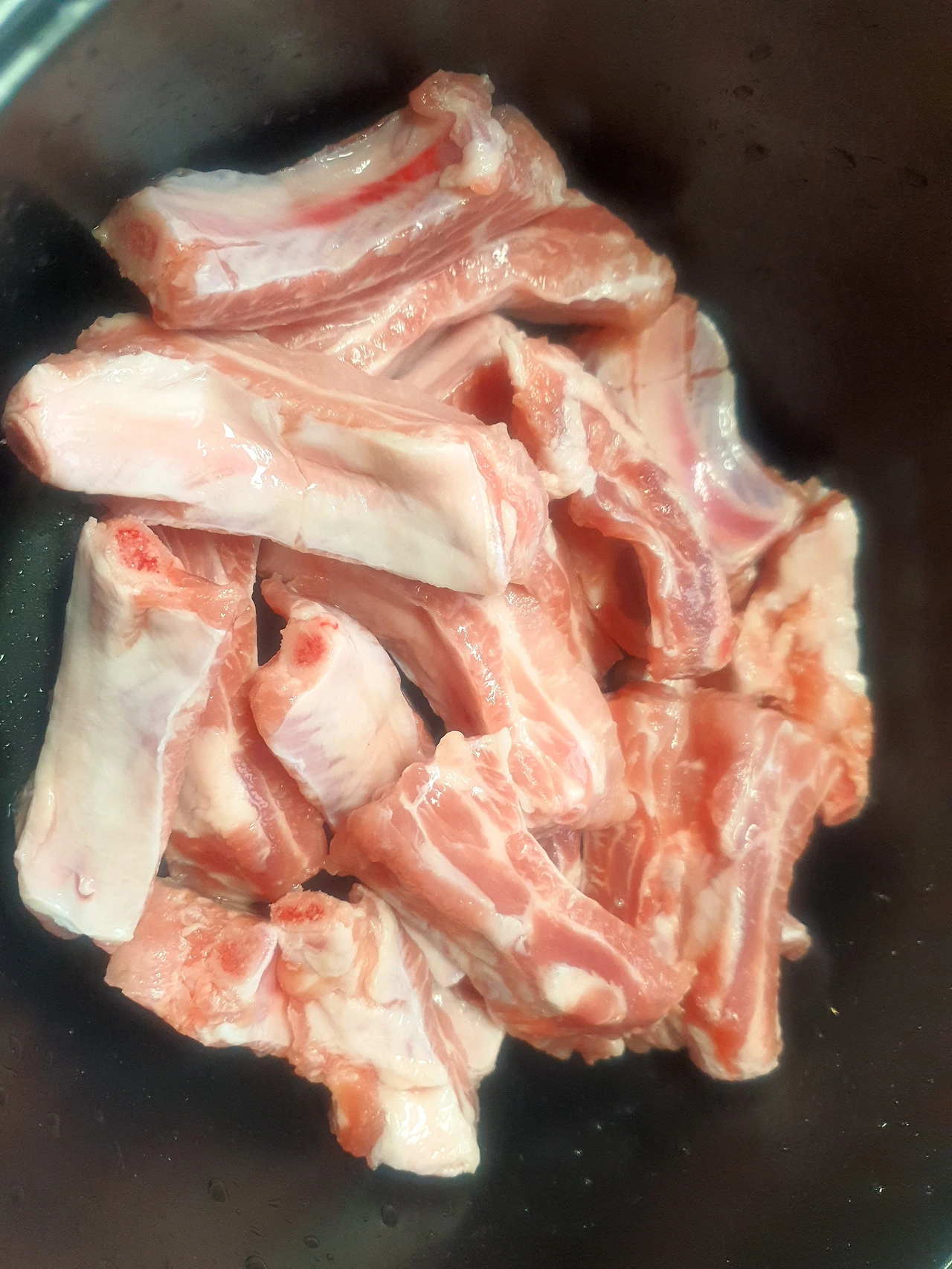 일단 등갈비는 팔팔 끓는 물에 살짝 데쳐내어, 깨끗이 씻어서 준비한다.(사실 등갈비는 물에 담가 핏물을 따로 빼지 않아도 되고, 귀찮다면 살짝 데쳐내는 것도 생략해도 된다) 나는 바빠서 생략~
