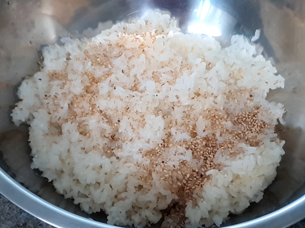 고슬고슬한 쌀밥에 가는소금을 넣어 간간하게 간하고, 참기름과 볶음참깨를 넉넉히 넣어 그냥 먹어도 고소 고소하게 맛난 밑밥을 만든다.