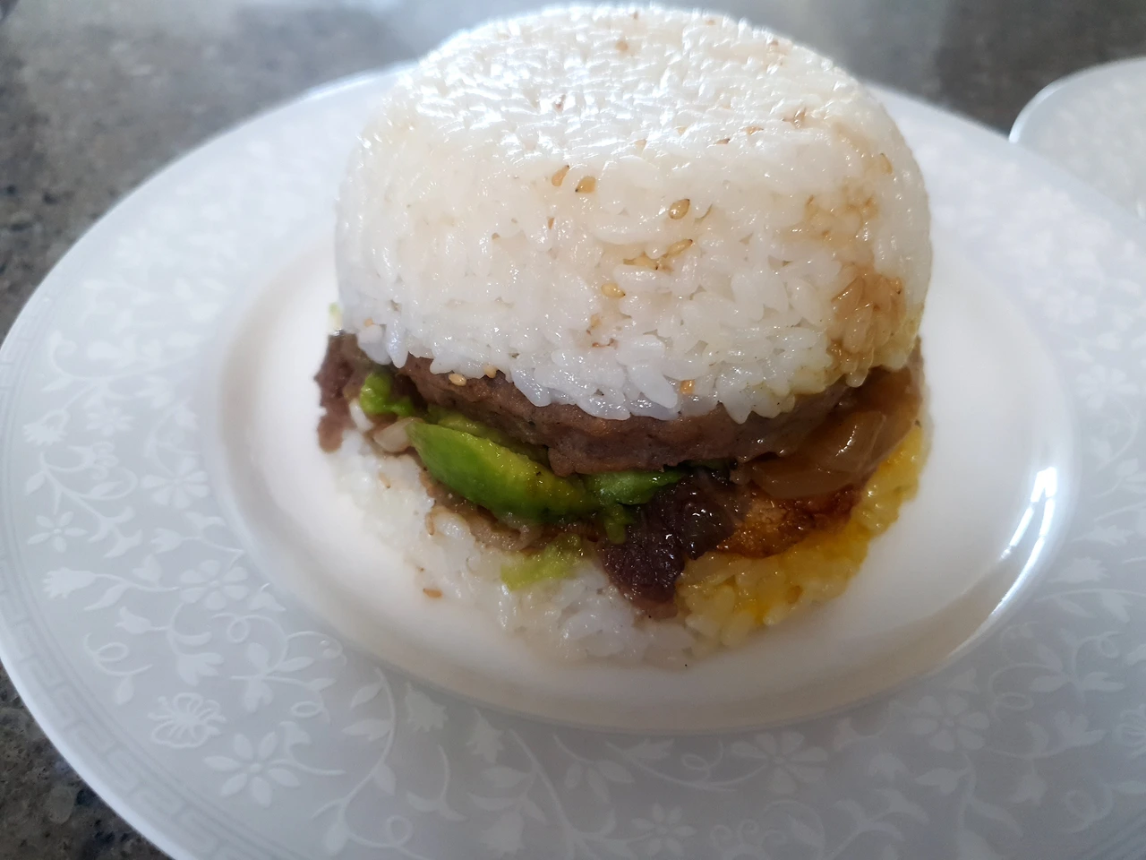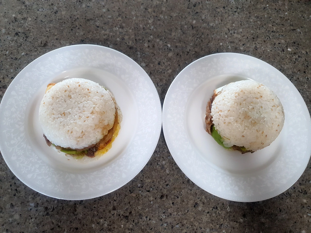 밥공기 하나 가져다가 비닐랩을 깔고 그 위에 차곡차곡 얻는다. 먼저 밥은 꾹꾹 눌러 햄버거 빵 모양이 되도록 다독여 준다. 그 위에 떡갈비 올리고, 불고기도 올리고, 계란프라이도 올리고, 아보카도도 올리고, 마무리는 또 밥을 꾹꾹 눌러 모양을 잡았다. 특별히 아보카도 위에 살짝 간장 양념을 뿌려서 느끼함을 잡아보려고 애는 좀 썼다. 비닐랩을 한데 모아 쏙 빼주기만 하면 밥버거 완성이다.