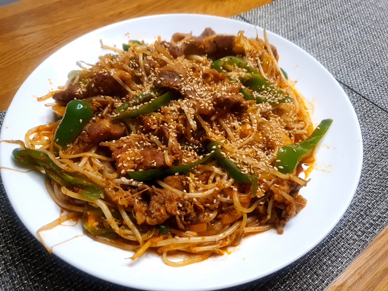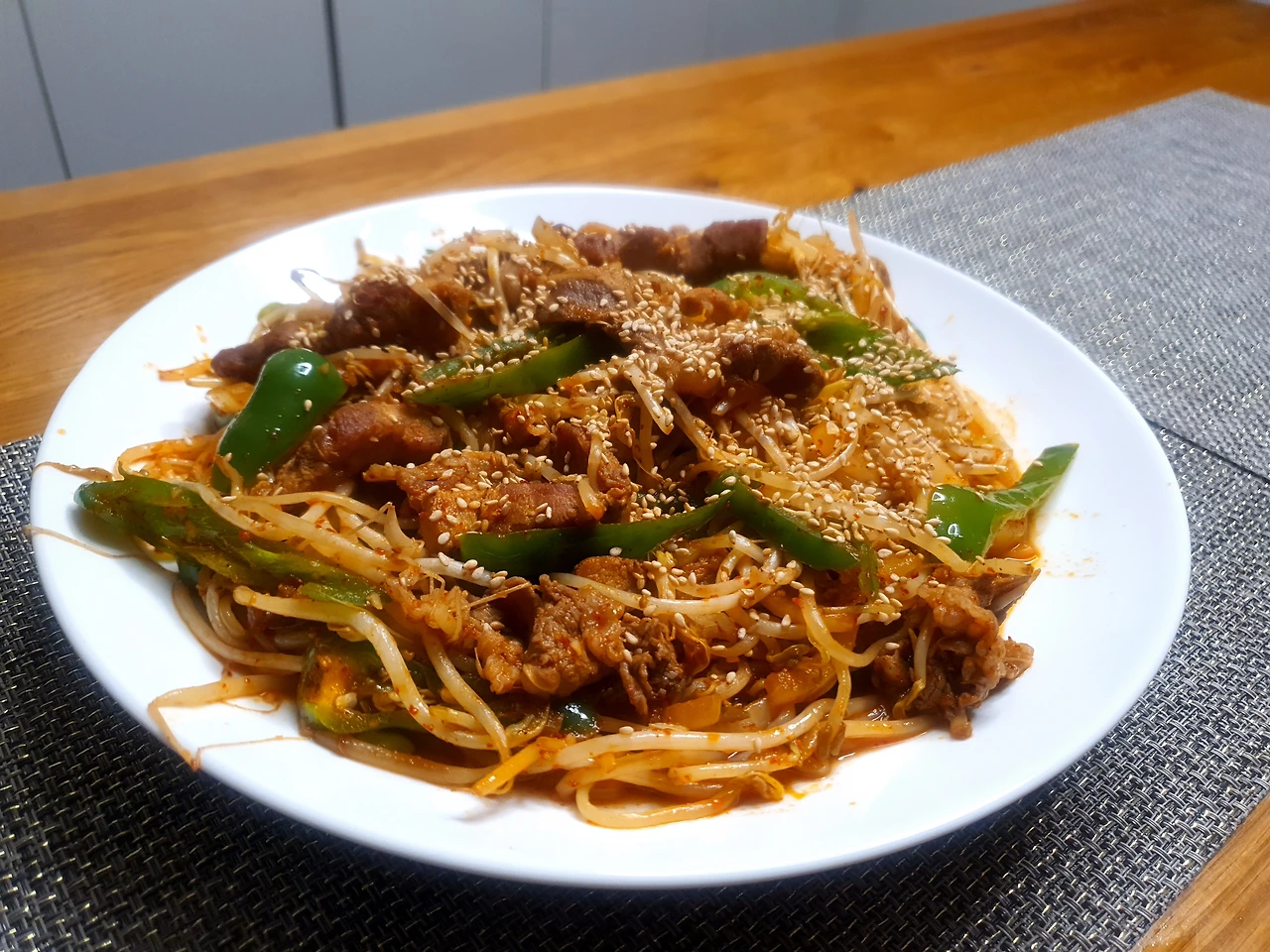두툼한 목살을 먼저 구워 검지 손가락 길이만큼 굵고 길게 썰었다. 거기에 차돌박이 넣어 구운 다음, 토치를 사용해 고기에 불맛 더하고, 잡내를 잡았다. 그 위에 물기 뺀 숙주나물 듬뿍 올리고, 양념장 넉넉히 둘러 달달 볶았다. 대파가 떨어져서 아삭이 고추 어슷하게 썰어 넣어 파릇한 식감 살렸다.