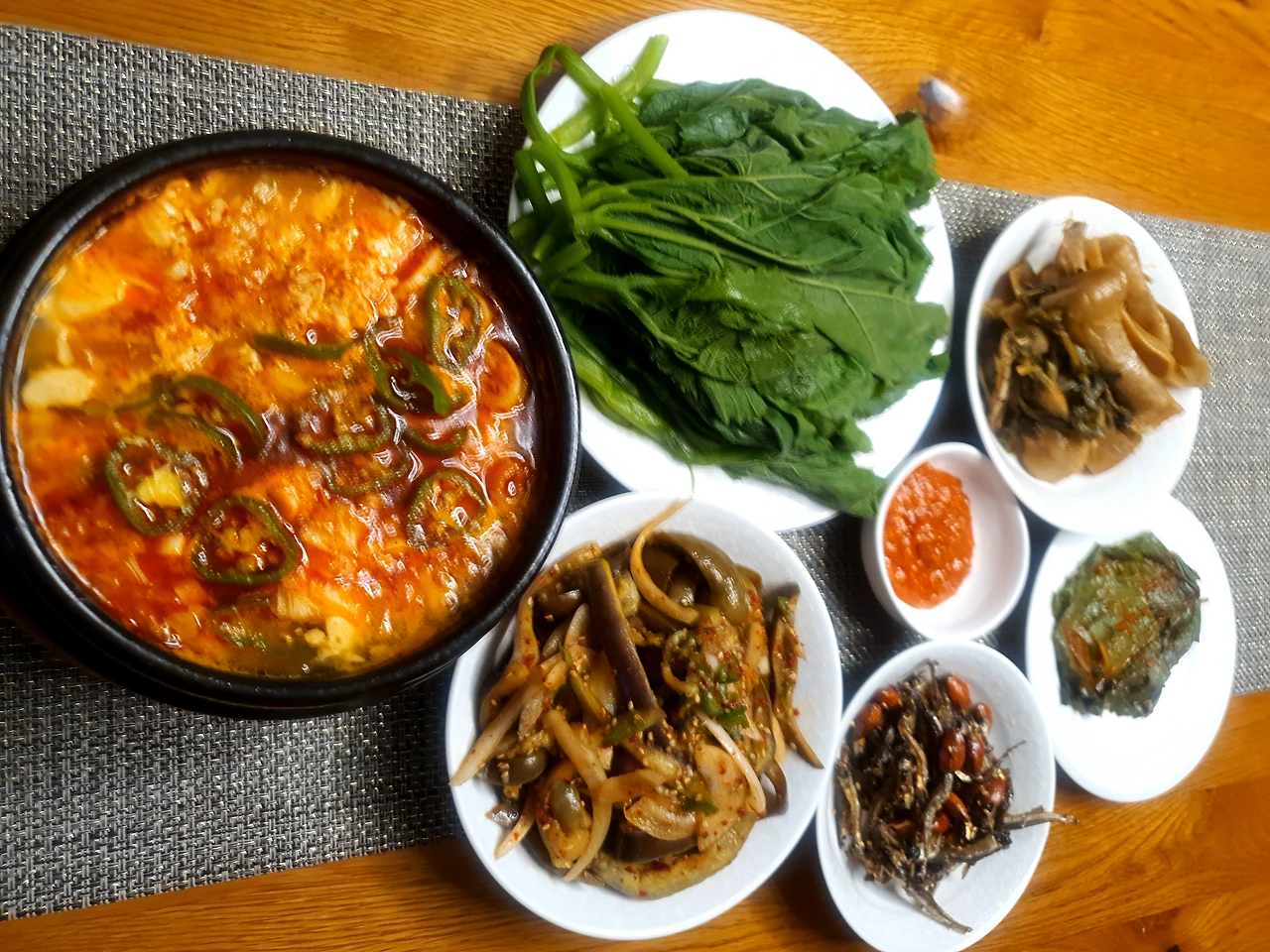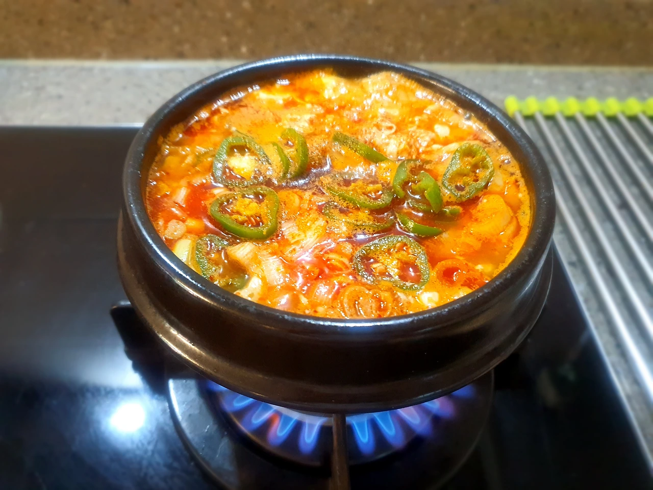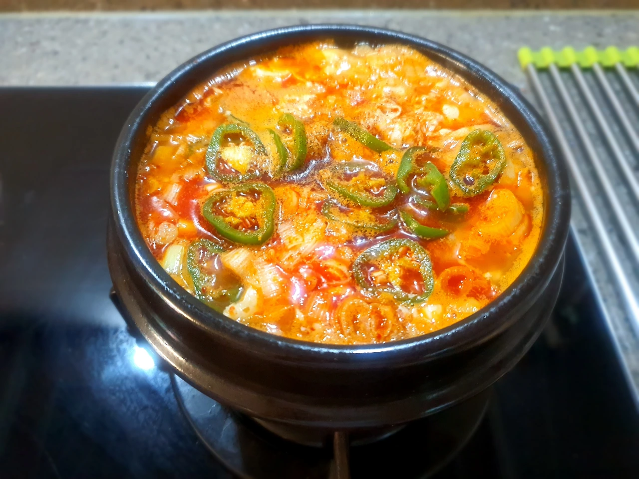 순두부 덤벙덤벙 썰어 넣고, 멸치와 다시마로 찐하게 만들어 놓은 육수 적당히 넣어 보글보글 끓인다. 마지막에 계란 두 알 까서 넣고, 다진 파와 다진 청고추 고명처럼 올려 마무리한다. 걸림 없이 부드러운 순두부만 호로록 호로록 목을 타고 내려가는 부드러운 감촉의 순두부찌개다.