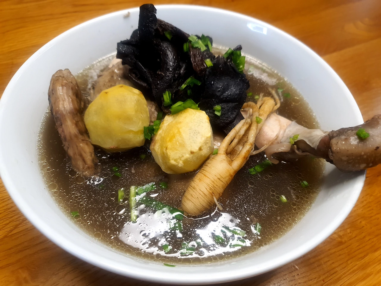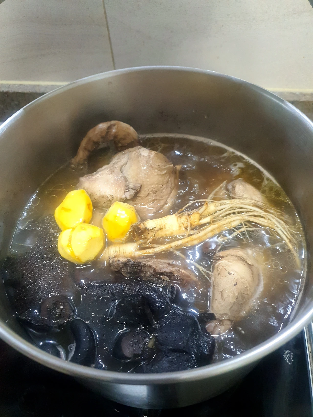 산양산삼 세뿌리 보태고, 알밤도 예쁘게 까서 넣었다. 능이버섯의 진한 향을 찐으로 느끼고파 딱 그것만 넣었다. 아니 아니 닭 두마리 4쪽내서.