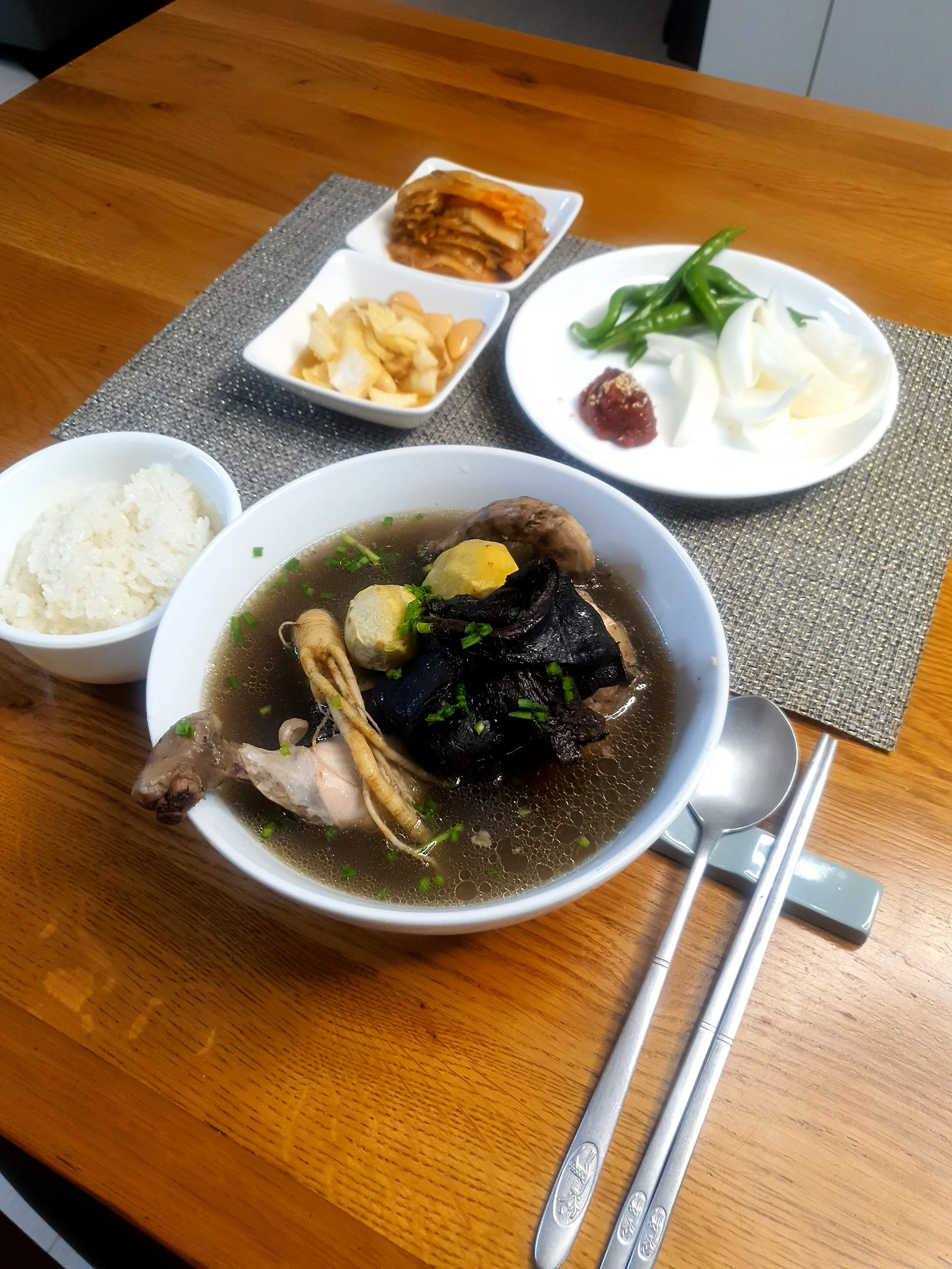 형부덕에 행복한 저녁식탁이다. 오늘 나는 행복동 늘봄식당 능이백숙전문점 사장님이다. 주문 들어오면 한그릇씩 정성으로 대접한다. 첫 손님! 어? 우리집 까도남 오시네.