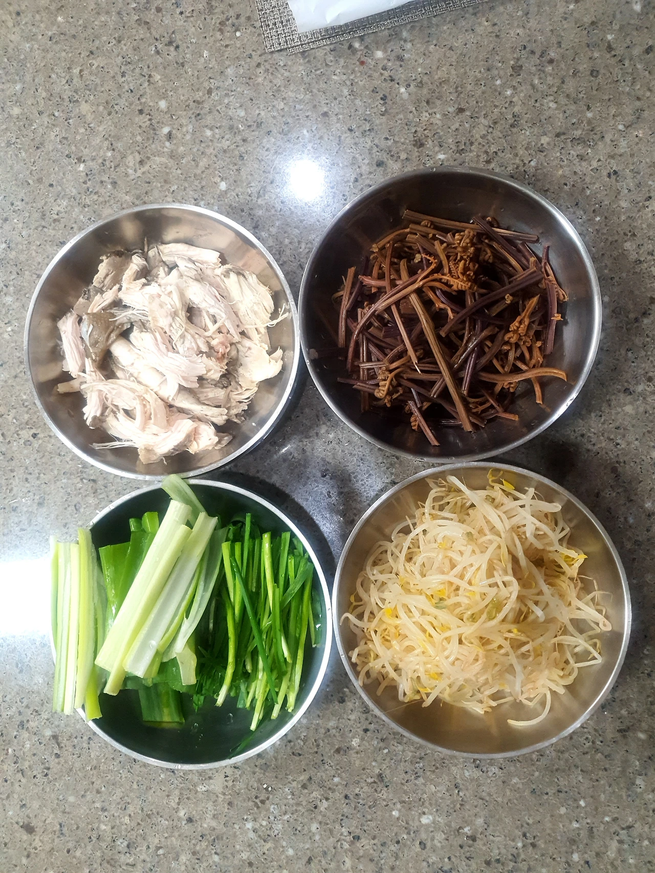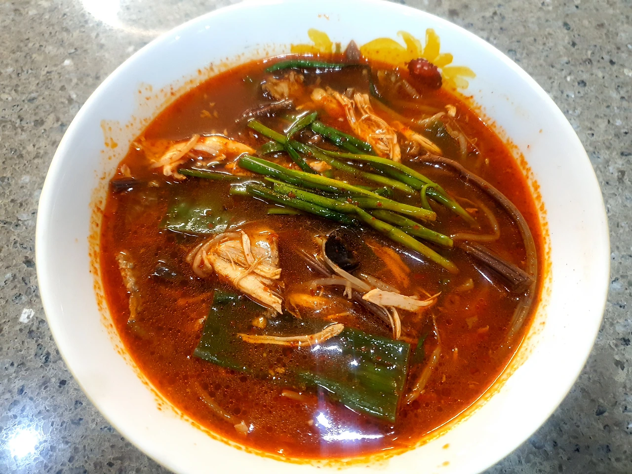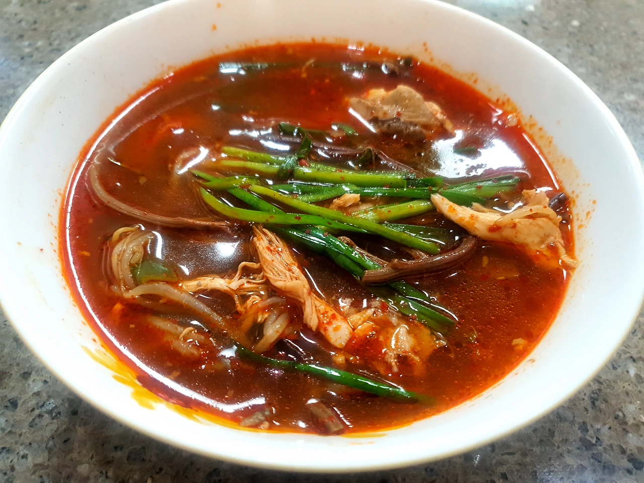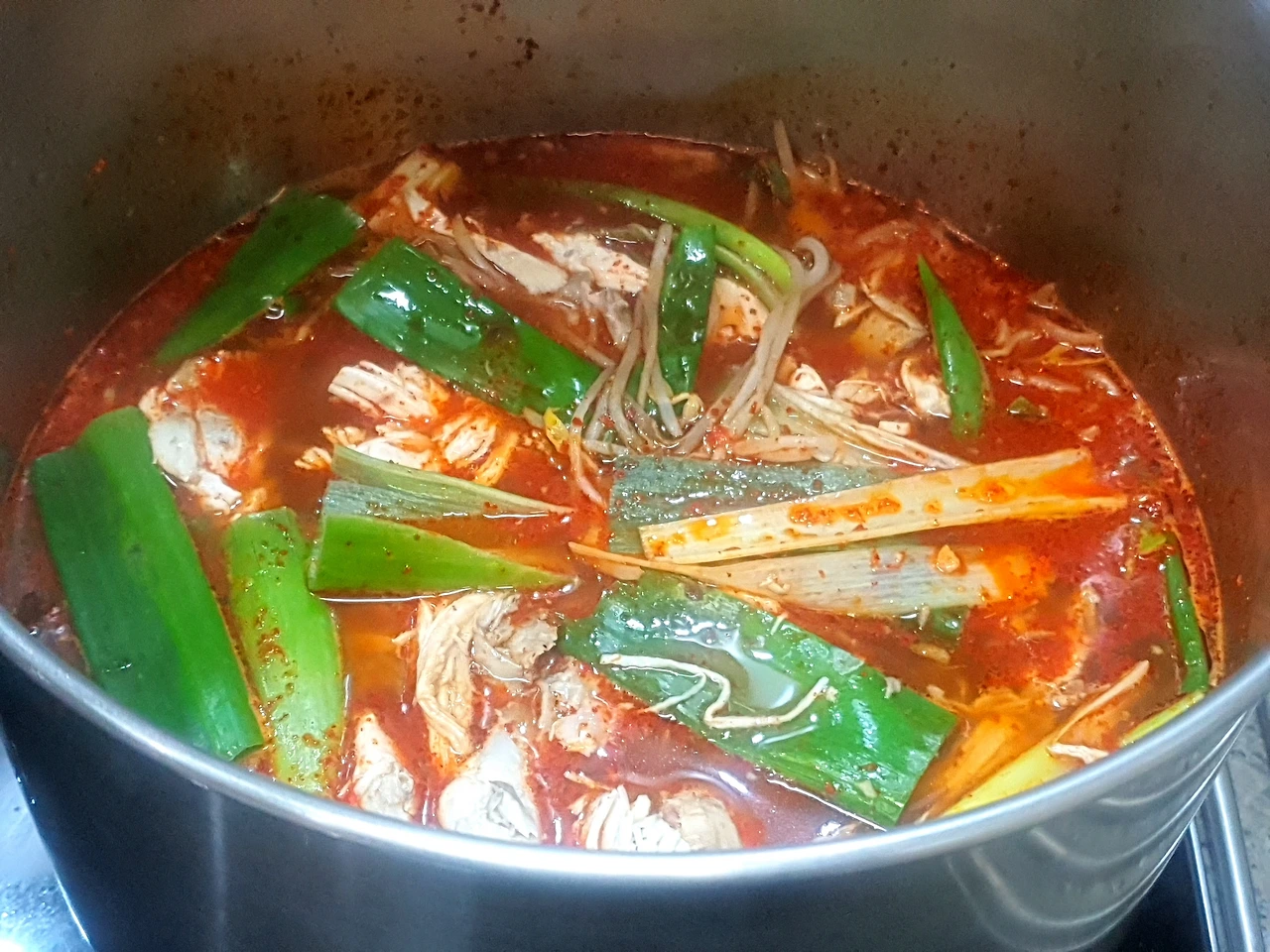 고추기름이 다 됐다 싶으면 육수도 좋고, 맹물도 좋고 편한 대로 먹을 양만큼의 국물을 만들어주면 된다. 거기에 고사리, 숙주, 대파, 닭고기를 넣어 푹 끓이고, 부족한 간은 국간장과 소금으로 마무리하면 된다.
