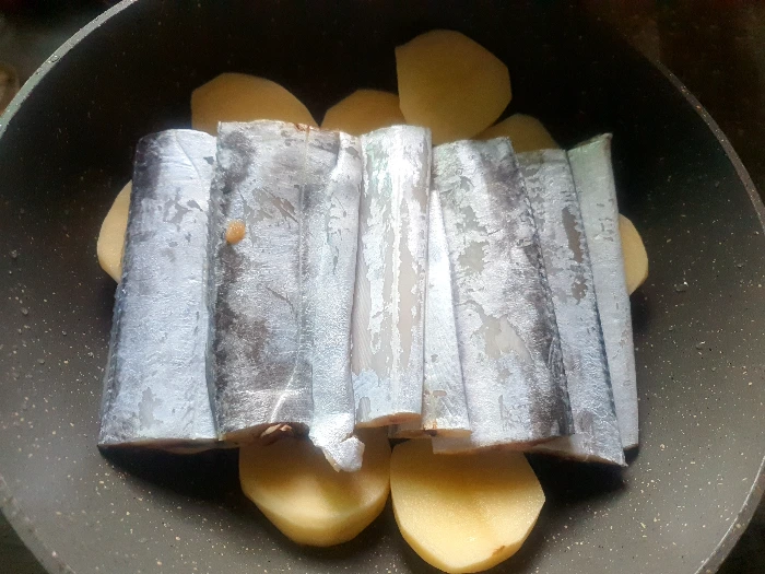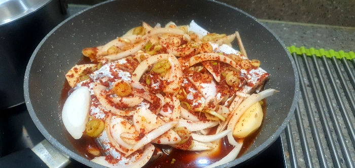 감자를 두툼하게 썰어 바닥에 깔고 그 위에 제법 큰 토막갈치 줄세워 올린다. 양파를 채썰어 흩뿌리고, 빠알간 양념옷 자작하게 입혀서 보글보글 끓여주면 된다.