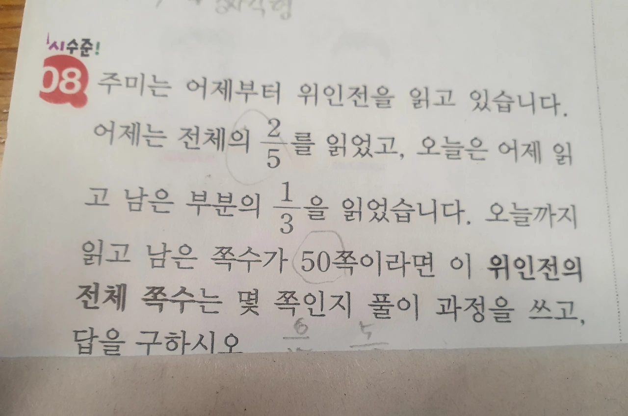 이젠 숫자라면, 잔돈 계산도 잘 안 되는 이 엄마가 초등 6학년 딸내미 앞에서 체면 구기기 싫어 1차 방정식을 세워가며 기를 쓰고 문제를 푼다는 게 어이가 없다. 신중하게 검산까지 마치고.... 틀렸음 어쩔 뻔!!