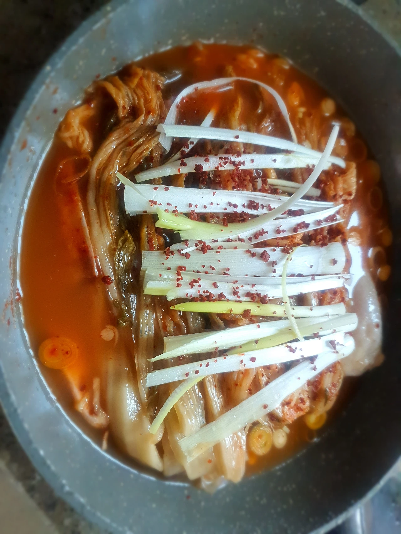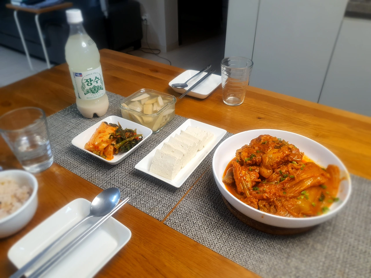 오늘은 그런 나에게 응원의 한잔을 보낸다. 택상과 내가 마주 앉아 도란 도란 막걸리 잔을 기울일때면 종종 함께 하는 그 안주와 함께. 바로 묵은지닭볶음탕! 장수 막걸리 두병 준비하고 말이다.
