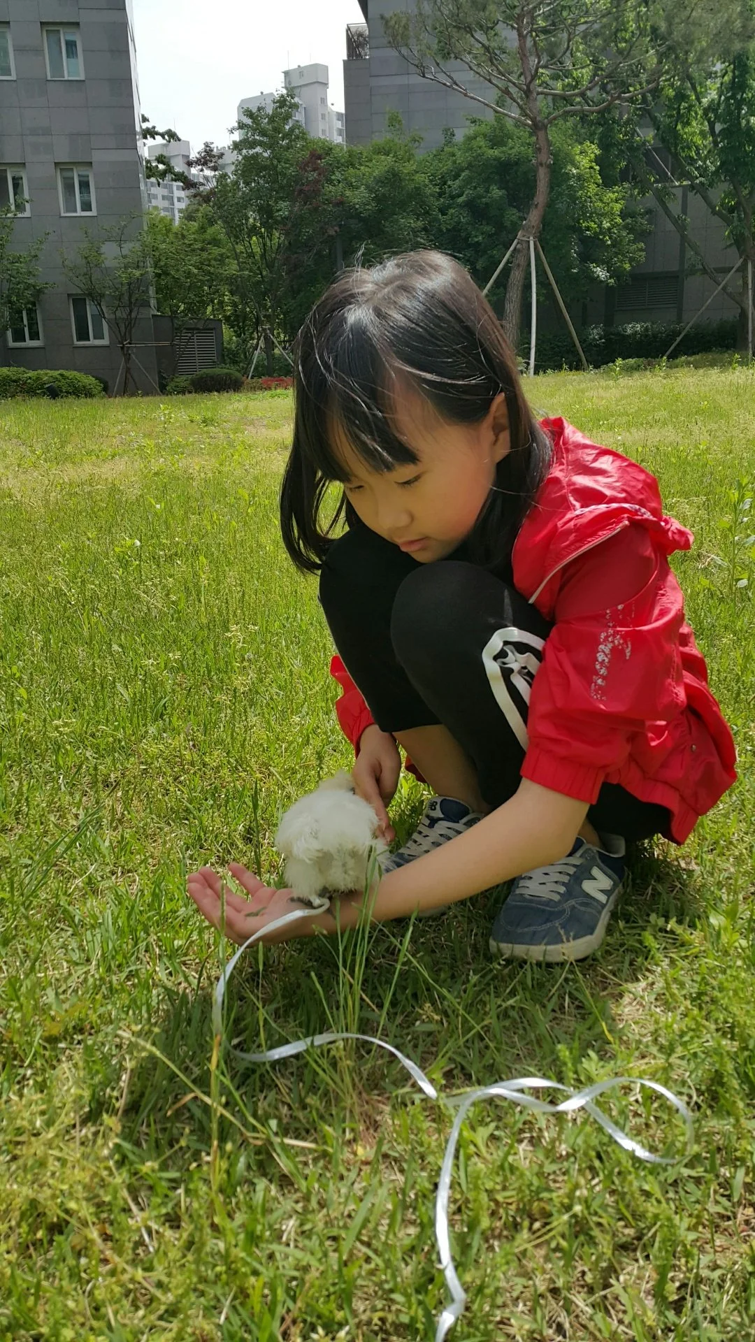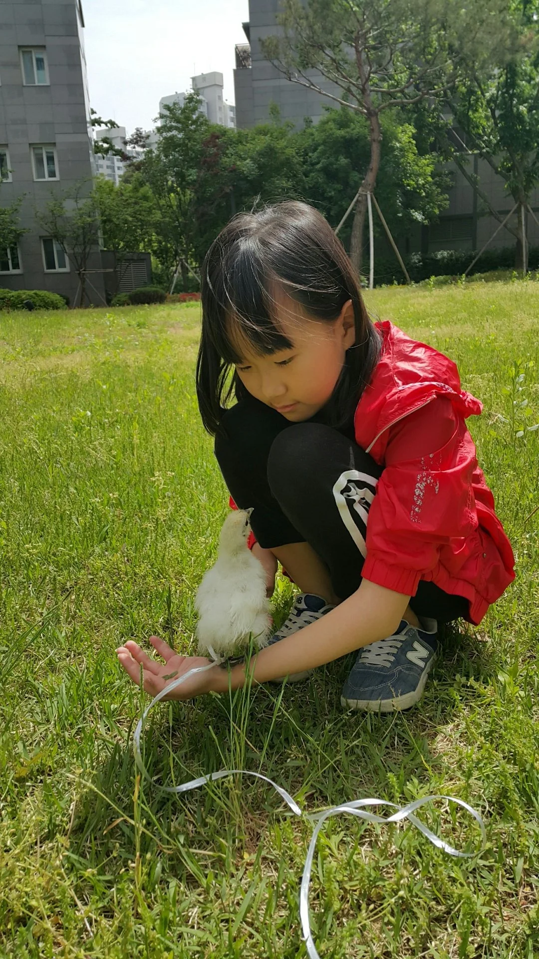 울 꼬맹이가 밤이면 명상음악까지 들려주며 지극정성으로 두 달 가까이 키웠다. 요 녀석 적응도 잘해 어찌나 잘 먹고 잘 크고, 잘 따르던지... 애완 강아지처럼 집 앞 잔디밭에 데리고 나가 산책도 시켜주고, 제 힘으로 콕콕 벌레 잡아먹는 경험도 시켜주며 울 꼬맹이가 신났었다. 그보다도 엘리베이터를 타고 오르내릴 때, 동네 산책시켜줄 때마다 신기하게 바라보며 부러워하는 동네 꼬맹이들과 사람들의 반응에 우쭐해서 울 꼬맹이가 그 시선을 더 즐겼던 것 같다.