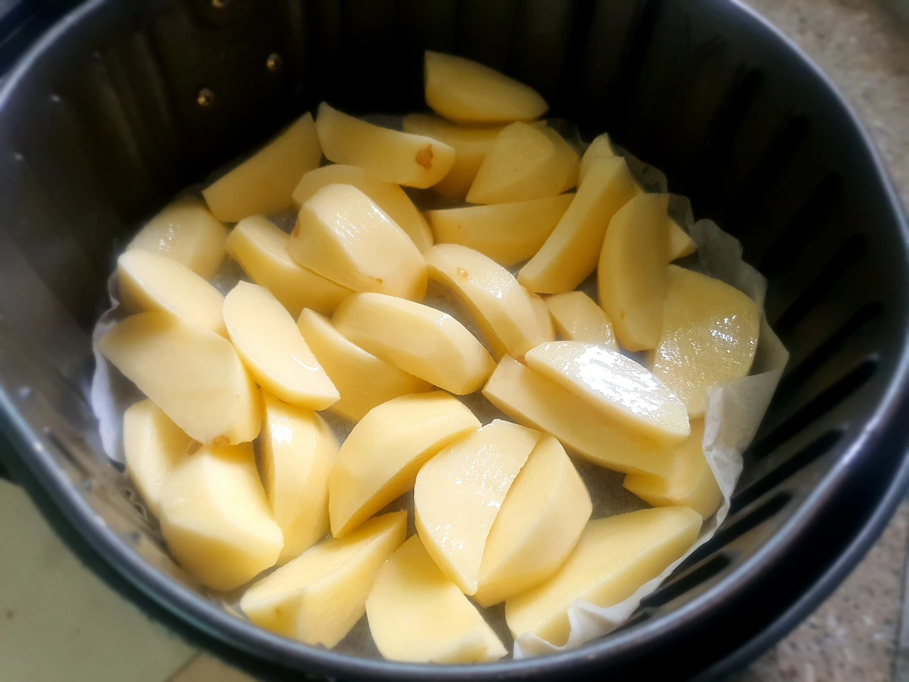 이번엔 에어프라이어에 굵게 썬 감자를 아마씨유 넉넉히 두르고, 기름종이를 깔고 그 위에 올려 25분간 180도 고온에서 돌려준다.