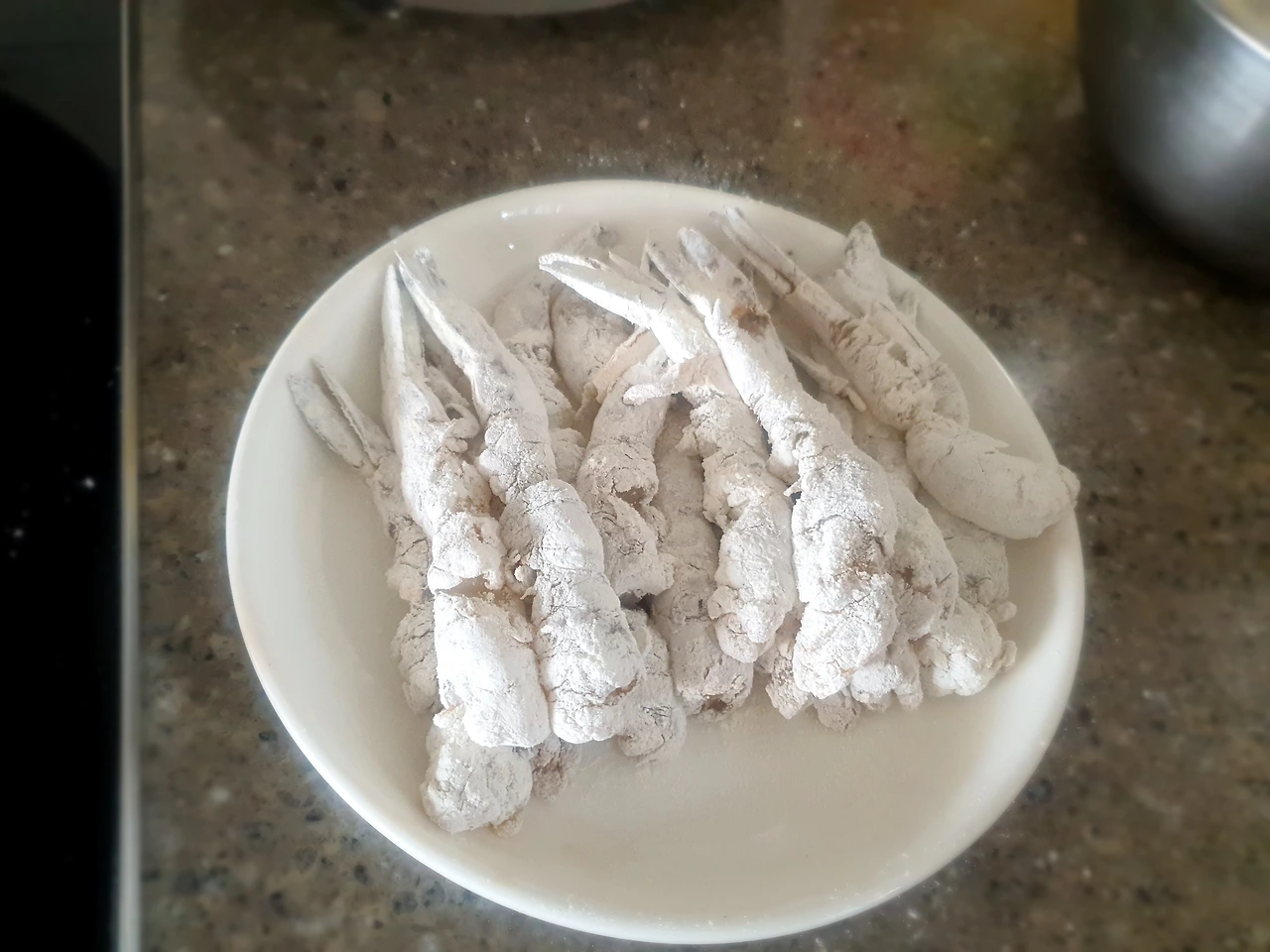 소금과 후추로 가볍게 밑간을 한다. 비닐에 튀김가루와 밑간 한 새우를 넣고 새우에 튀김가루가 빈틈없이 묻도록 잘 흔들어준다. 꺼내서 가지런하게 접시에 담고 튀길 준비를 한다.