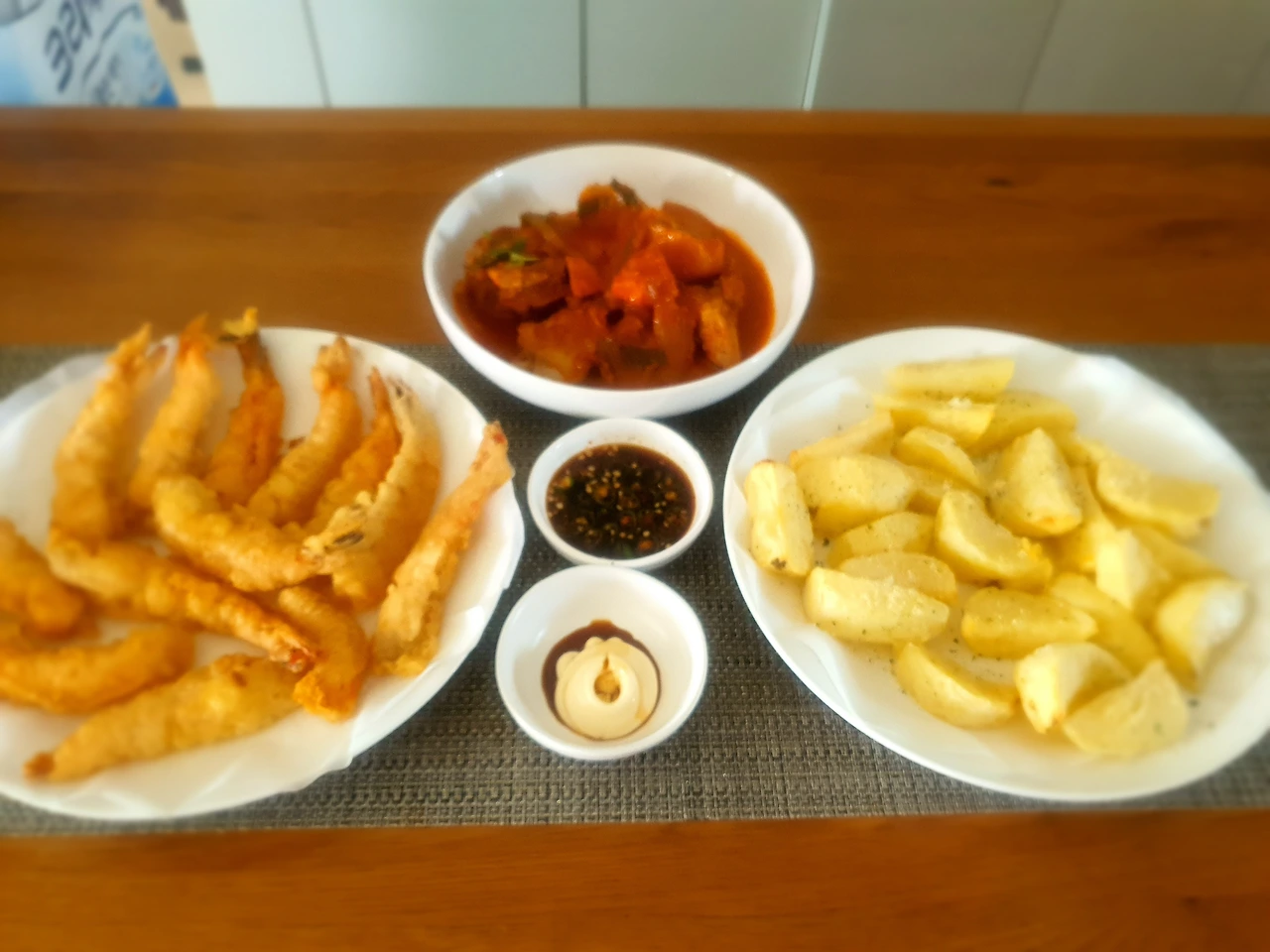 우리 조카부부! 눈이 휘둥그레진다. 새우튀김도 감자튀김도 진짜 집에서 만든 것 맞냐고!
