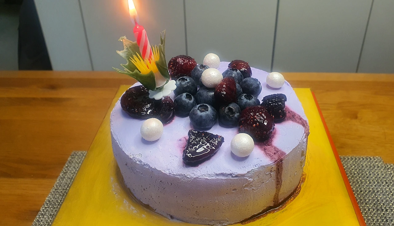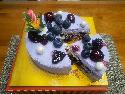 너무 궁금해서 기다릴 새도 없이 상자를 열었다. 우와! 정말 예쁘기도 하고 맛있어 보이기도 하다. 하얀 생크림에 블루베리 콤포트 국물을 섞어서 예쁘게 화장한, 보랏빛 도는 케이크 위에 무화과 조림과 생블루베리와 진주초코릿볼로 장식했다. 엄마 눈엔 너무 훌륭하다. 촛불도 켜고 파티를 해야 할 것 같다. 꼬맹이는 뭔가 아쉬운 모양인데, 내 눈에는 완벽하다. 어쩜 이렇게 잘 만들었냐고 대단하다고 엄청 칭찬을 해주었다.