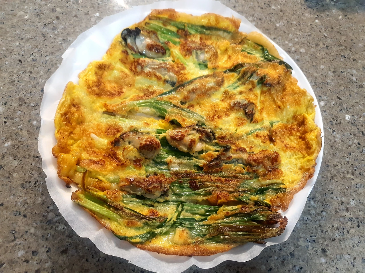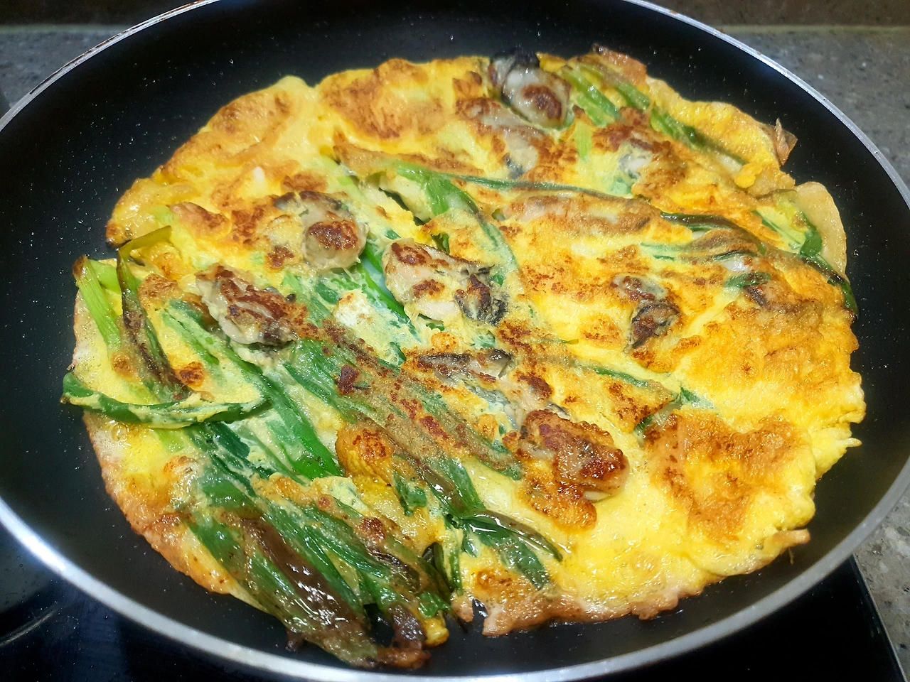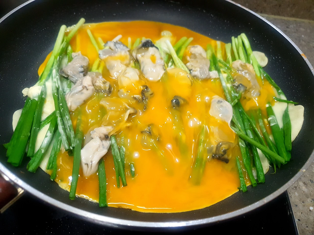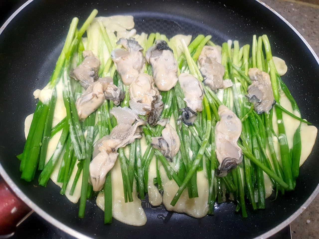 줄세운 파 위에 굴을 예쁘게 올려고 잘 풀어놓은 계란물을 그 위에 쭈욱 둥글게 뿌려주었다. 바닥이 타지 않도록 팬을 계속 흔들 주는 걸 잊지 말아야 한다. 파 위에 올려진 계란물이 적당히 익을때까지 팬을 흔들어가며 살핀다. 프라이팬을 움직여 휘릭 파전을 뒤집어도 계란물이 흘러내리지 않을 정도로 익으면, 팬을 가볍게 공중에 들어올려 파전을 위로 살짝 띄워 전을 뒤집어준다.