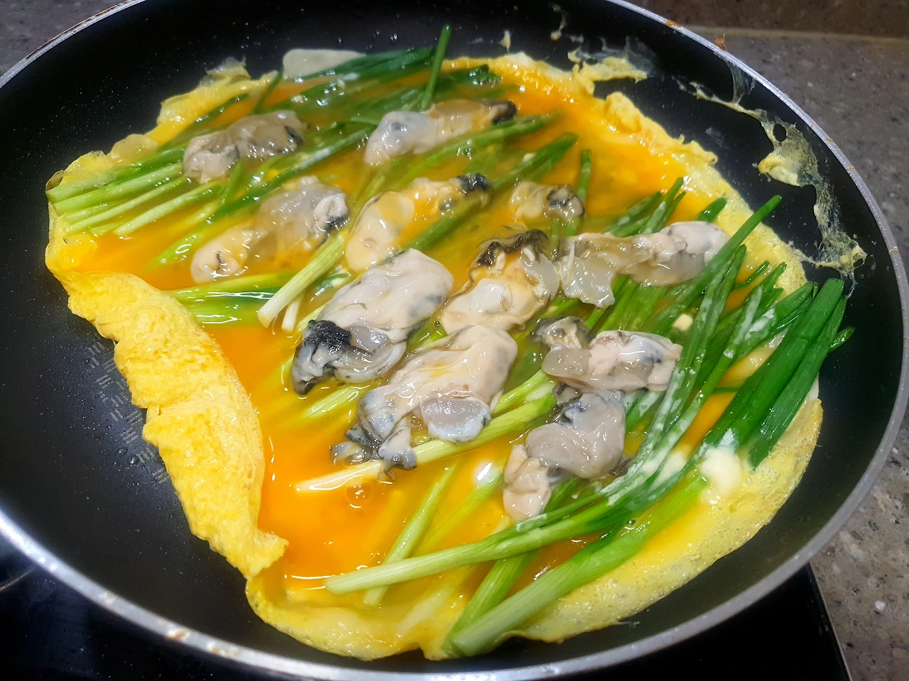 게란은 고온에 금방 타기 쉽기 때문에 불을 약하게 하여 굴이 익을 수 있게 팬을 적당히 흔들어가며 익혀준다. 제법 익었겠다 싶을 때 센 불로 올려 바삭바삭하게 익혀준다.