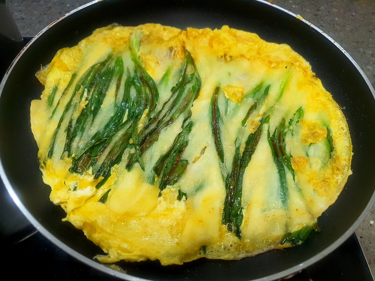 지난번엔 밀전을 부치듯 먼저 밀가루 반죽을 팬에 동그랗게 두르고 난 다음 그 위에 파를 지그시 눌러 올렸다. 그러고 나서 파 위에 반죽을 조금 더 덪올려주었다. 그러다 보니 밀가루 반죽이 두꺼워질 수밖에 없었다.