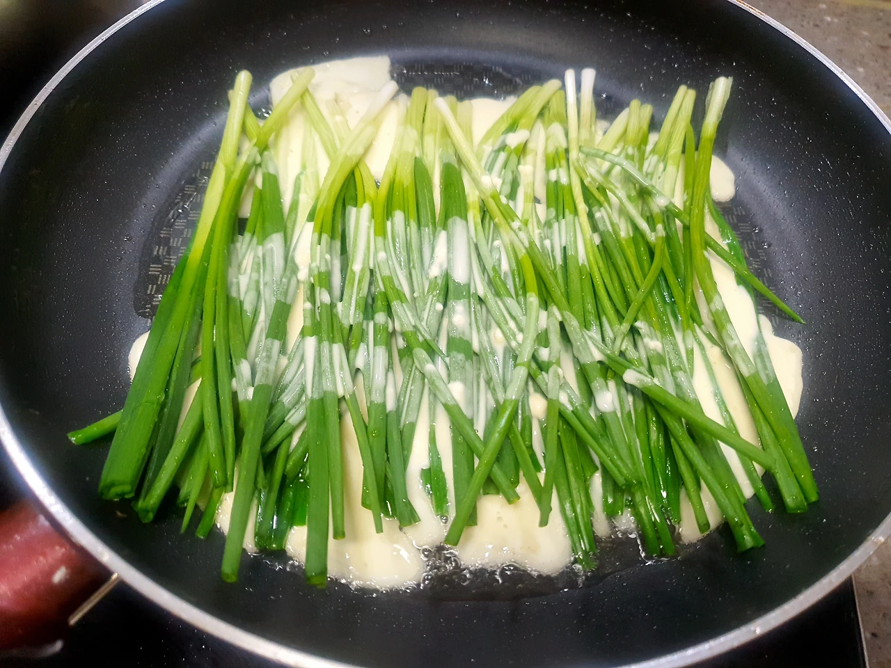 그래서 이번엔 약한 불에 팬을 올려놓고 먼저 파를 쪼르르 나란히 쫙 펼쳐 놓았다. 그리고 그 위에 묽은 밀가루 반죽을 살짝 뿌려 주었다. 밀가루 반죽은 나란히 줄세운 파들을 붙여주는 용도로만 최소로 쓰고 싶어서 말이다.