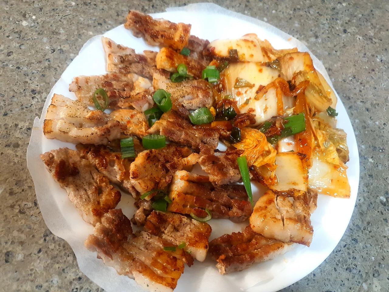 아이들을 위해선 벌집무늬 예쁘게 세겨진 삼겹살을 김치와 함께 구워본다.