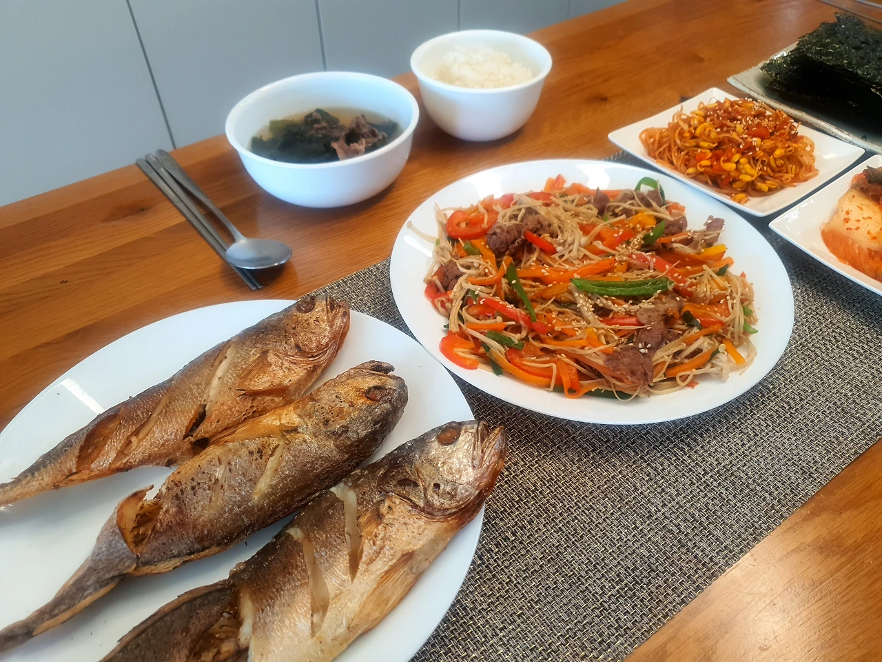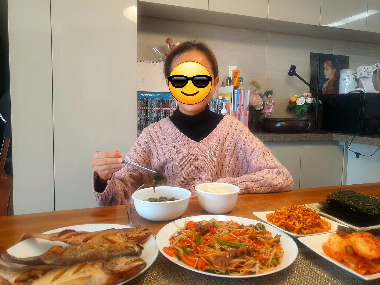 생일 점심엔 미역국에 조기구이에 울 꼬맹이가 최애하는 팽이버섯 볶음 한접시 해서 소박한 생일상 대령하고,저녁엔 모두 함께 피자와 케이크로 마무리 했다.