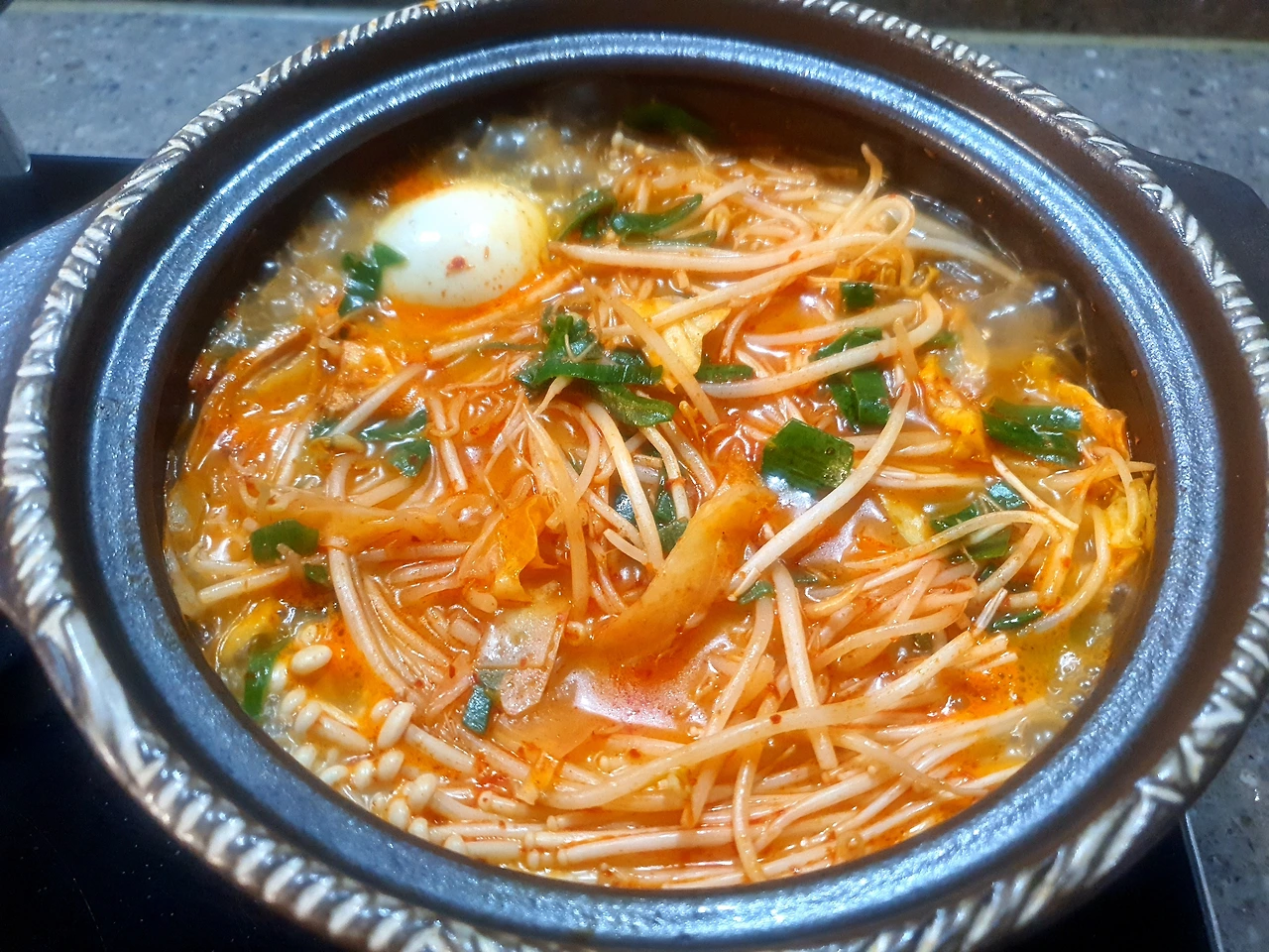 비비고 곰탕 한팩을 뚝배기에 쏟아붓고, 훠궈마라탕소스 두 스푼정도 풀어넣고 끓이다가, 당면과 쌀국수 면을 넣고 6분 정도 끓였다. 면이 거의 다 익어갈 무렵 준비해 둔 각종 야채를 넣고, 한소끔 더 끓여주었다.