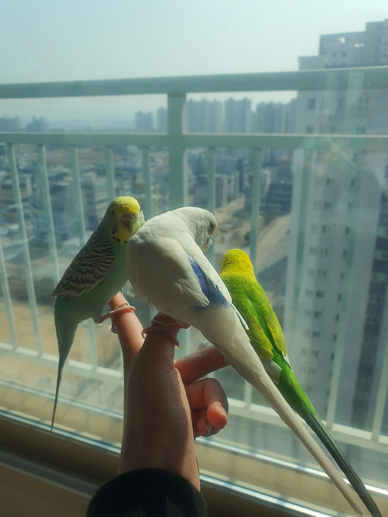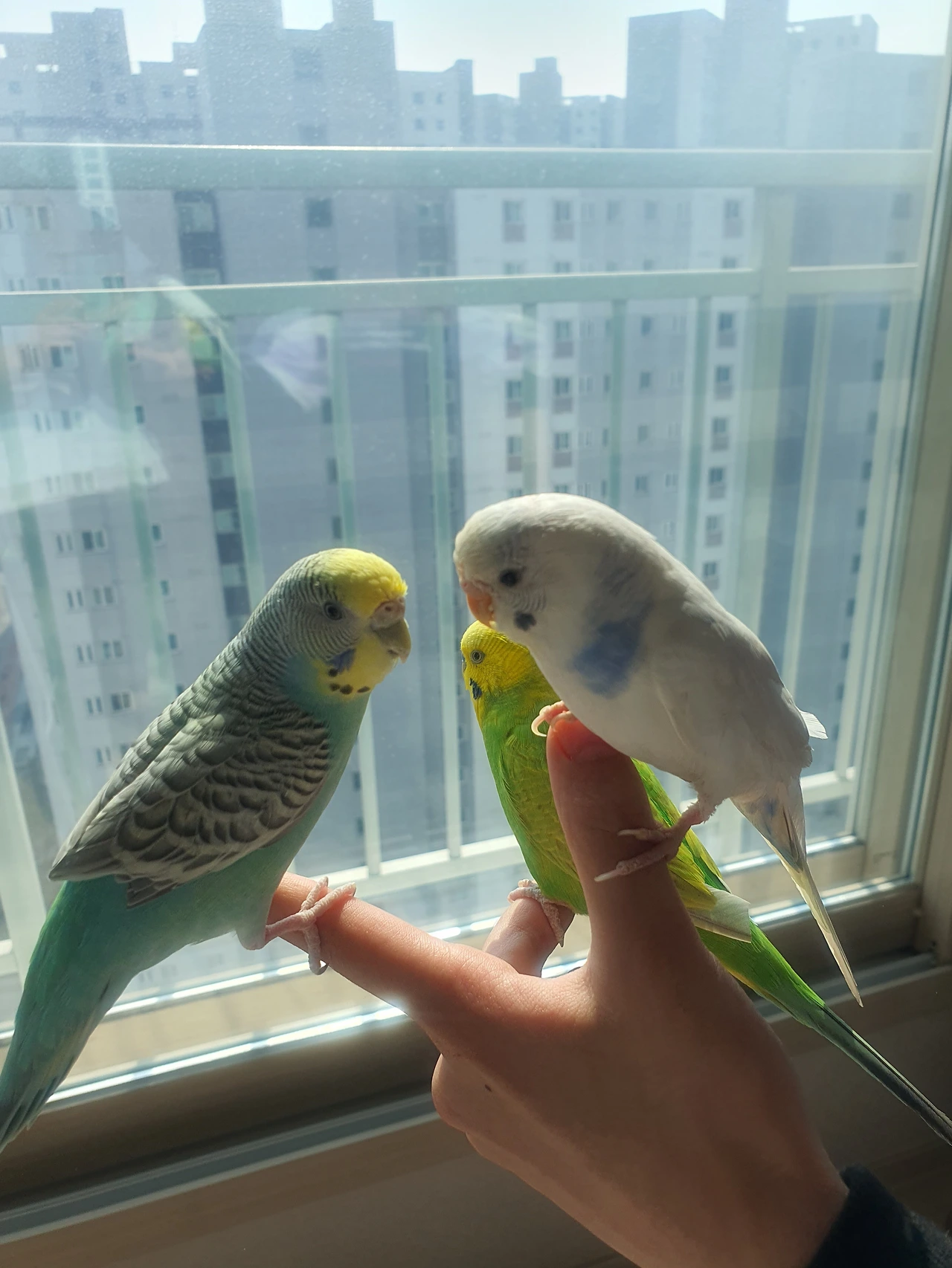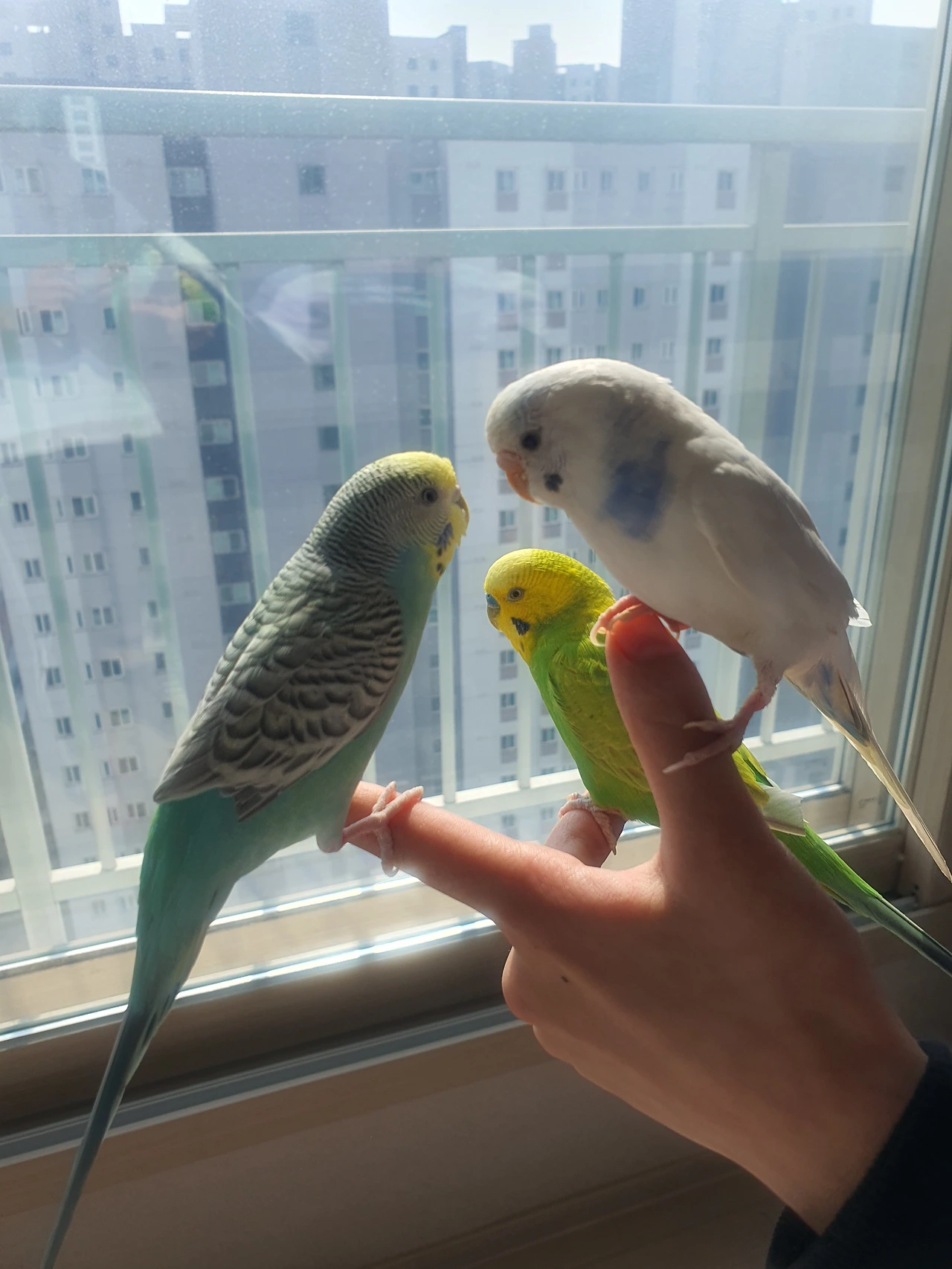 창가에서 즐거운 한때를 보내는 우리집 잉꼬앵무 친구들.... 앵두 연두 목련이