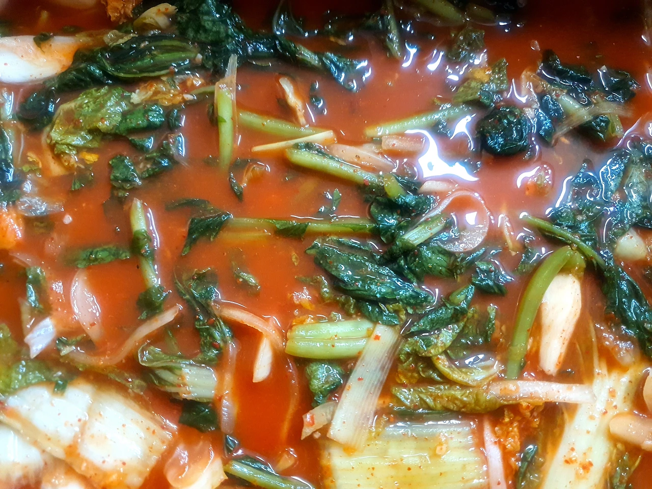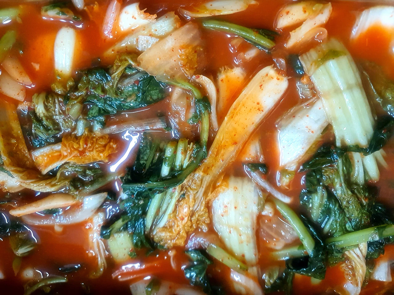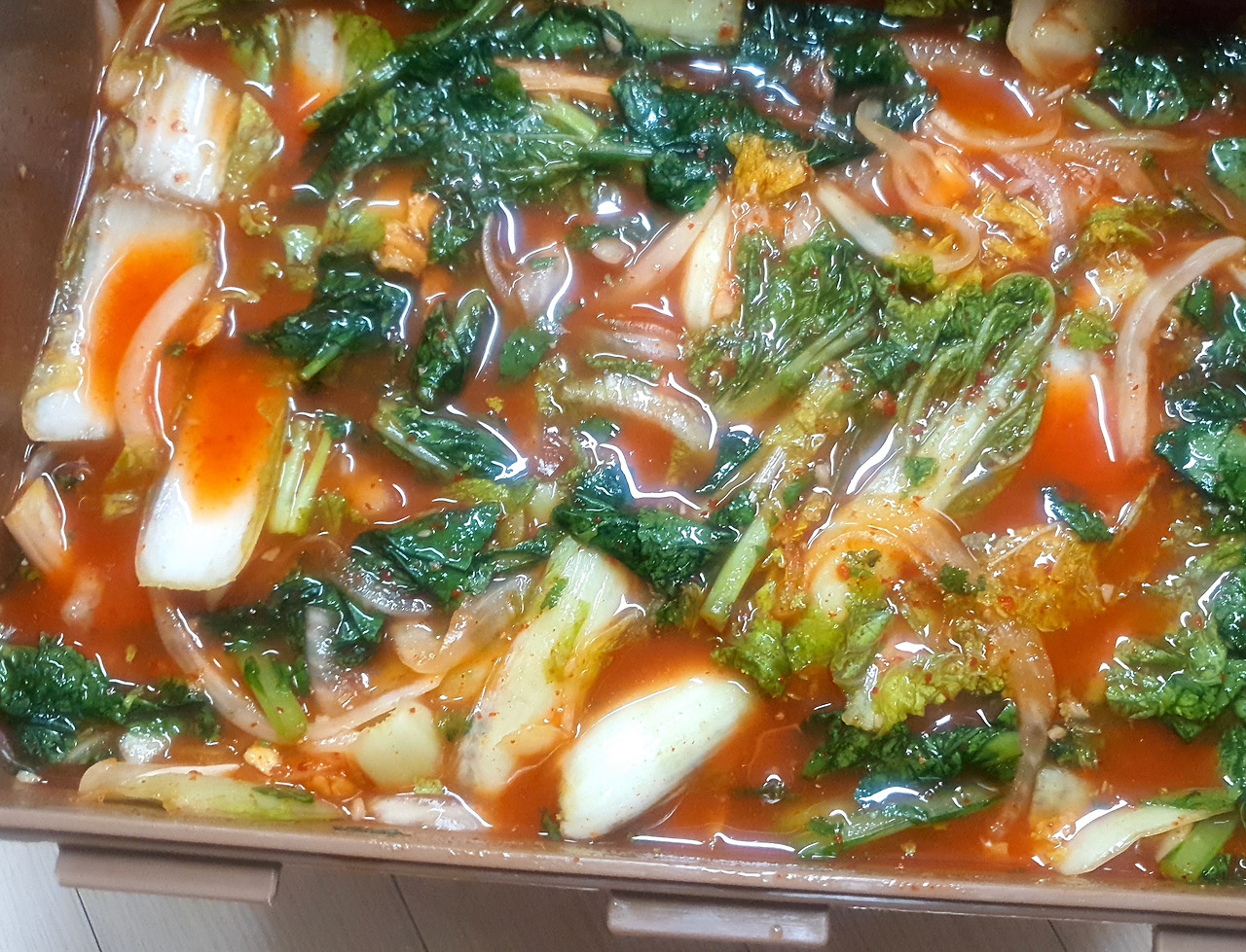 이렇게 소금에 절이지 않고 담은 열무얼갈이김치는 절여서 담는 김치보다 훨씬 연하고 질기지 않다는 장점이 있다.