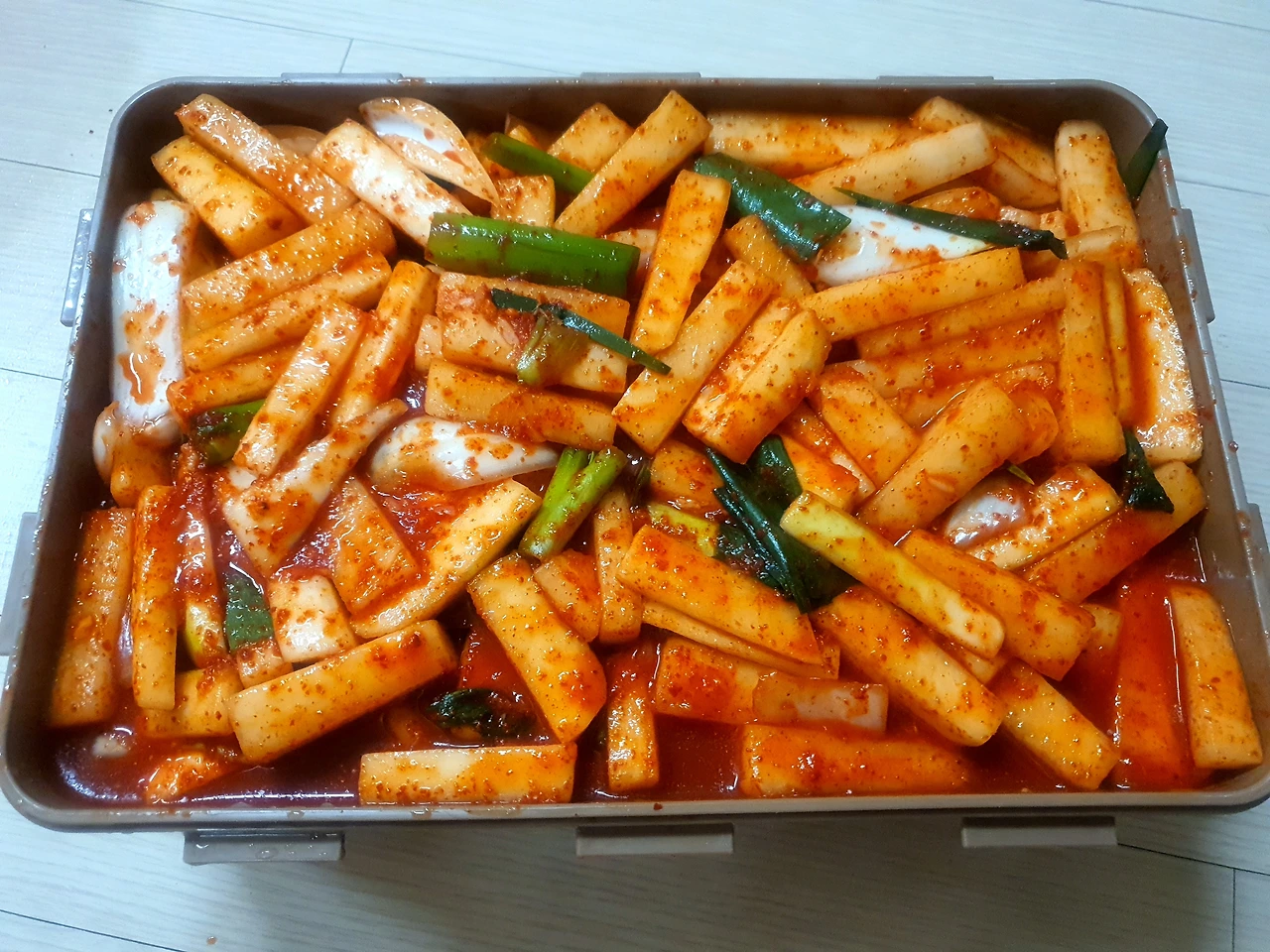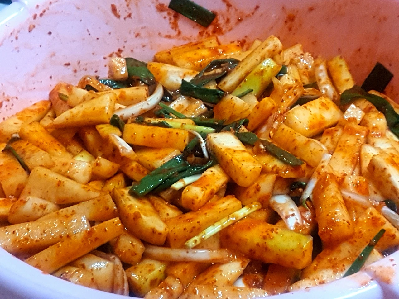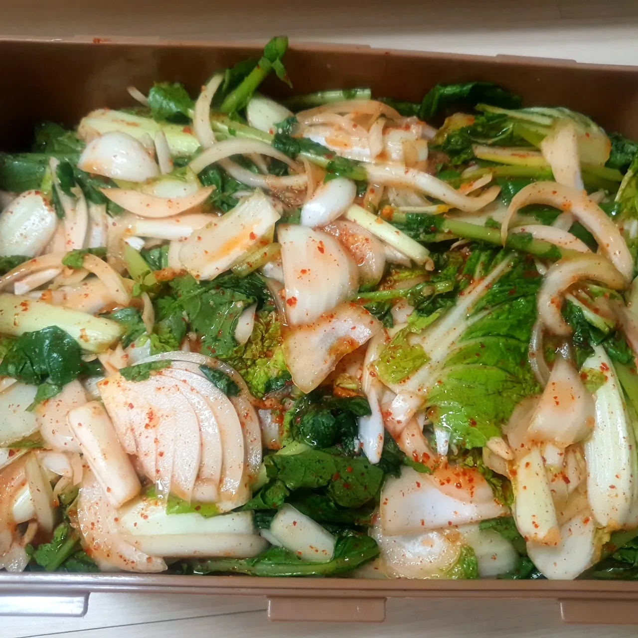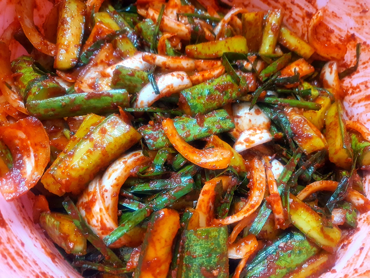 그리고 그 위에 양념장을 좌르르 끼얹어 뒤적뒤적 골고루 버무린 다음, 김치통에 다독다독 담는다.