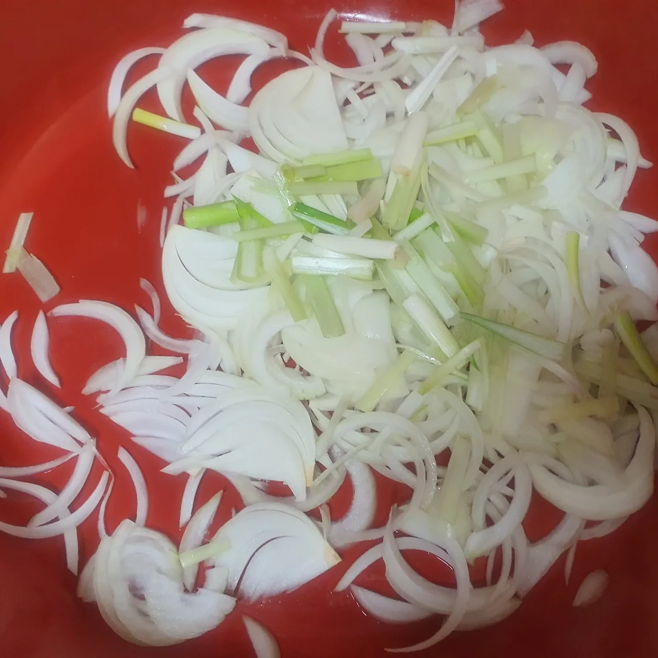 큰 그릇에 양파 가늘게 채 썰어 넣고, 깨끗이 씻은 열무와 얼갈이도 먹기 좋게 잘라 넣는다.