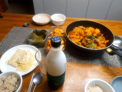 제비아빠는 퇴근길에 비 온다고 막걸리 한 병을 들고 귀가했다. 오랜만에 시원하게 목을 축이고 싶었나 보다. 국물도 진하게 맛있고, 삼겹살도 보들보들하니 입맛 당긴다. 또 아이들 심심하지 않게 떡볶이떡 한주먹 넣었더니, 그것도 떡볶이를 먹는 듯 기분 좋다.