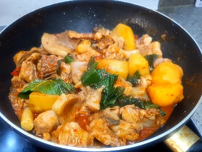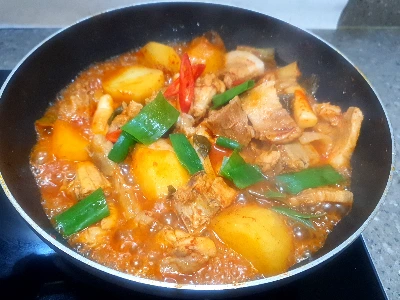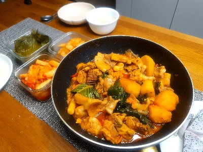 먼저 팔팔 끓는 물에 볶음탕용 생닭 한팩을 뜯어 튀기듯 데쳐내 깨끗하게 씻어준다. 불순물도 제거하고, 기름기도 최소화하고저 이렇게 데쳐내는 것이다. 데친 닭고기에 진간장, 고추장, 고춧가루, 다진 마늘, 다진 파, 후추, 생강, 설탕등 갖은양념을 골고루 섞어 잘 머무려 준다. 거기에 양파 한알, 감자 두 알 정도 적당한 크기로 잘라 같이 섞어준다. 그리고 모든 재료가 자작하게 잠길 정도의 생수를 넣어 불위에서 모든 재료가 잘 어우러지도록 불을 조절해 가며 푹 끓여주기만 하면 된다. 국물이 졸아들면 졸아들수록 맛은 진해진다.
