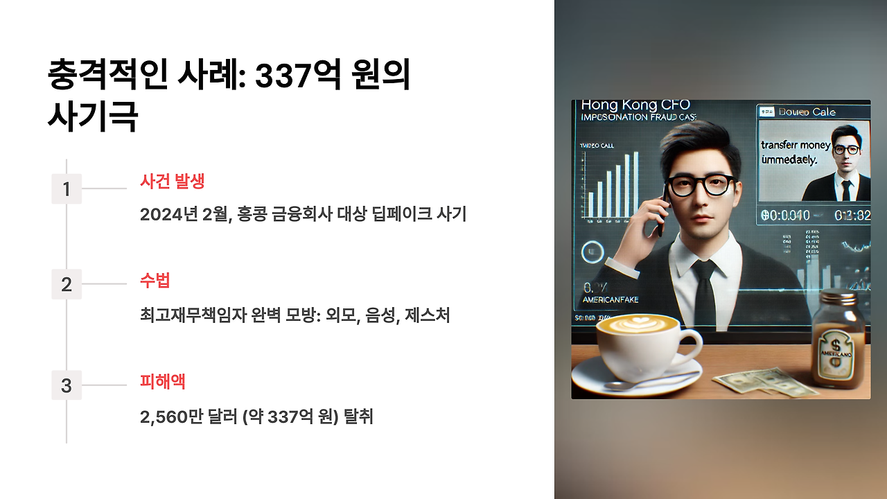 화상회의 속 홍콩 금융회사 최고재무책임자(CFO)의 목소리는 평소와 다름없이 침착했다. 검은색 넥타이와 흰 셔츠, 테이블 위 반쯤 마신 아메리카노, 심지어 안경을 매만지는 그의 습관적인 제스처까지 모든 것이 완벽했다. 하지만 그것은 '디지털 가면'을 쓴 범인이었다. 2024년 2월, 한 직원은 이렇게 2,560만 달러(한화 약 337억 원)를 범인의 손에 넘겼다. 며칠 뒤 진짜 최고재무책임자가 휴가에서 돌아왔을 때는 이미 늦었다.