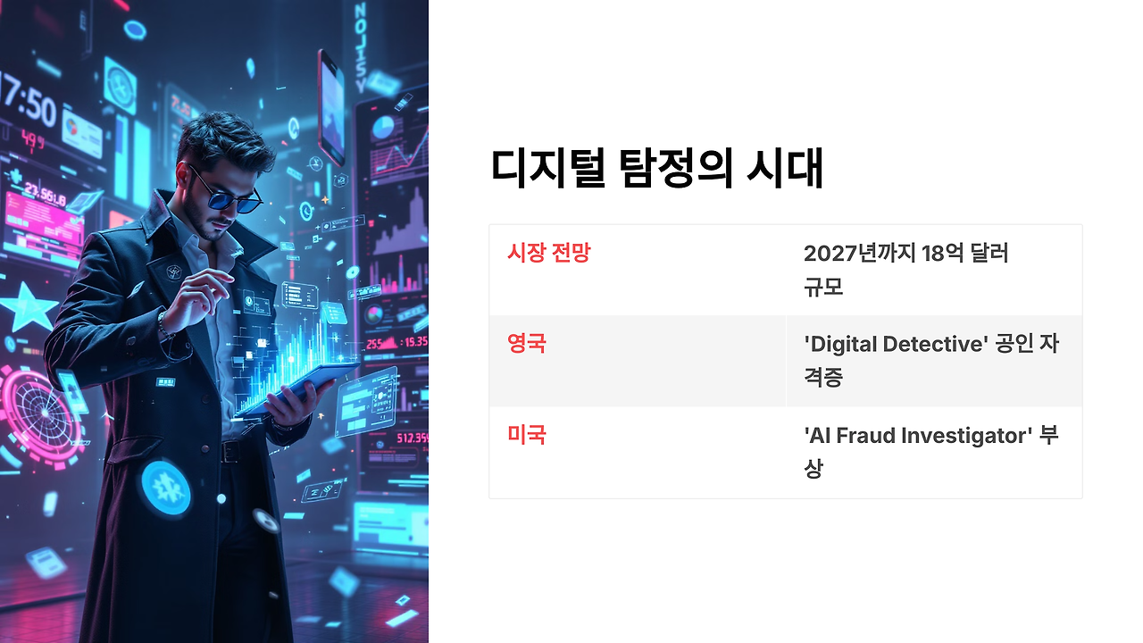 글로벌 딥페이크 탐지 기술 시장은 2027년까지 18억 달러 규모로 성장할 전망이다. 하지만 우리나라에는 아직 '사이버 탐정'이라는 직업이 공식적으로 인정되지 않는다. 반면 영국에서는 이미 'Digital Detective'가 공인된 자격증이 되었고, 미국의 실리콘밸리에서는 'AI Fraud Investigator'가 새로운 직종으로 주목받고 있다.