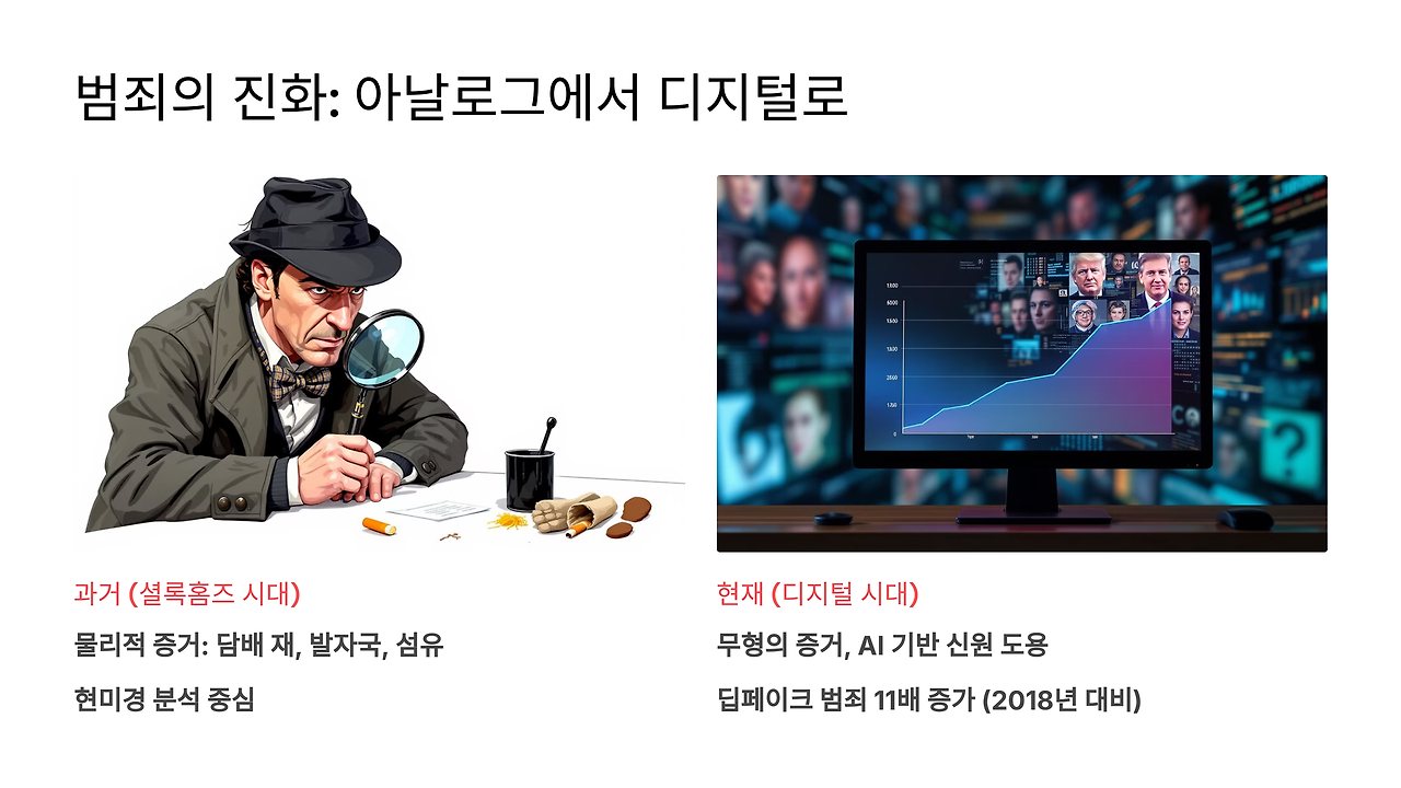 셜록홈즈가 살았던 시대에는 담배 재와 발자국이 결정적 증거였다. 현미경으로 들여다본 미세한 섬유 하나가 범인을 특정하는 단서가 되었다. 하지만 21세기의 범인들은 더 이상 물리적 흔적을 남기지 않는다. 그들의 무기는 칼이나 총이 아닌, 당신의 정체성을 완벽히 복제하는 인공지능이다.