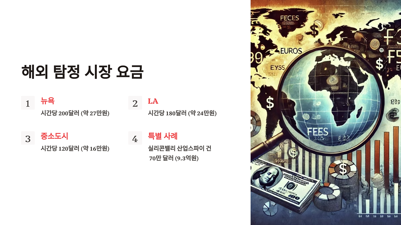 이런 흐름은 해외에서도 마찬가지입니다. 미국의 경우, 뉴욕의 탐정들은 시간당 200달러(약 27만원), LA는 180달러(약 24만원), 중소도시는 120달러(약 16만원) 선이죠. 하지만 이는 기본 요율일 뿐입니다. "실리콘밸리의 한 기업이 산업스파이 건으로 의뢰가 왔었어요. 한 달 만에 해결했는데... 그때 받은 수임료가 70만 달러(약 9억 3천만원)였죠."