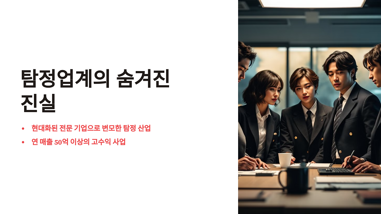 이 분야를 살펴하면서 가장 놀랐던 것 중 하나는, 우리가 전혀 모르고 있던 대형 탐정 회사들의 존재였습니다. 탐정 업무의 특성상 비밀보호가 생명이다 보니, 겉으로는 전혀 드러나지 않은 채 조용히 운영되는 큰 규모의 탐정 업체들이 있었던 거죠.