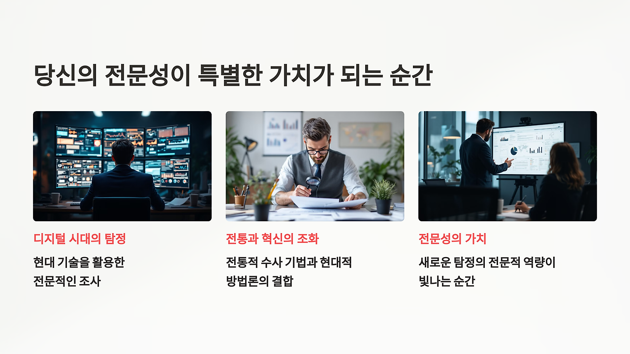 세상은 점점 더 복잡해지고 전문화되고 있습니다. 의료 사고, 금융 사기, 부동산 분쟁, 지식재산권 침해... 모든 영역에서 전문성을 갖춘 조사관의 필요성이 커지고 있죠.