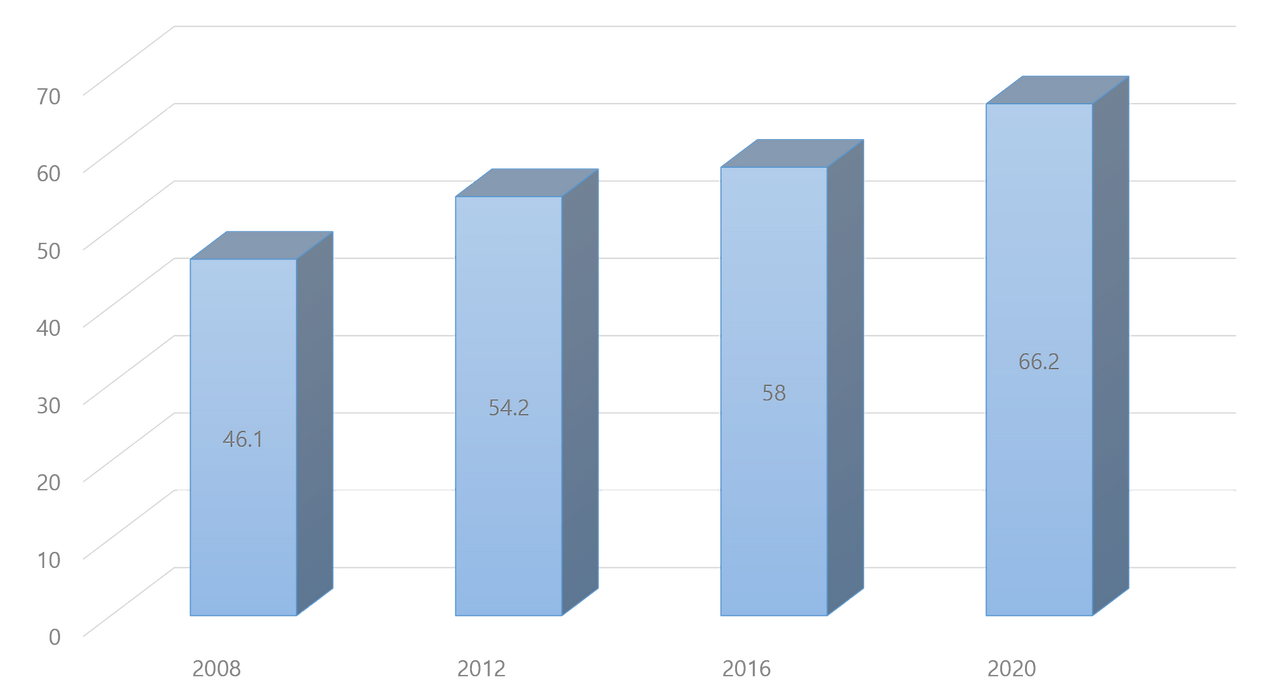 그러던 것이 뚜렷한 증가하기 시작했습니다. 바로 다음인 2012년 선거에서는 54.2%로 절반 이상이 자신의 투표권을 행사했고, 2016년에는 58%, 가장 최근에 치러진 2020년 총선은 무려 66.2%라는 수치를 기록했습니다. 12년 만에 20%p가량 증가했음을 알 수 있습니다.