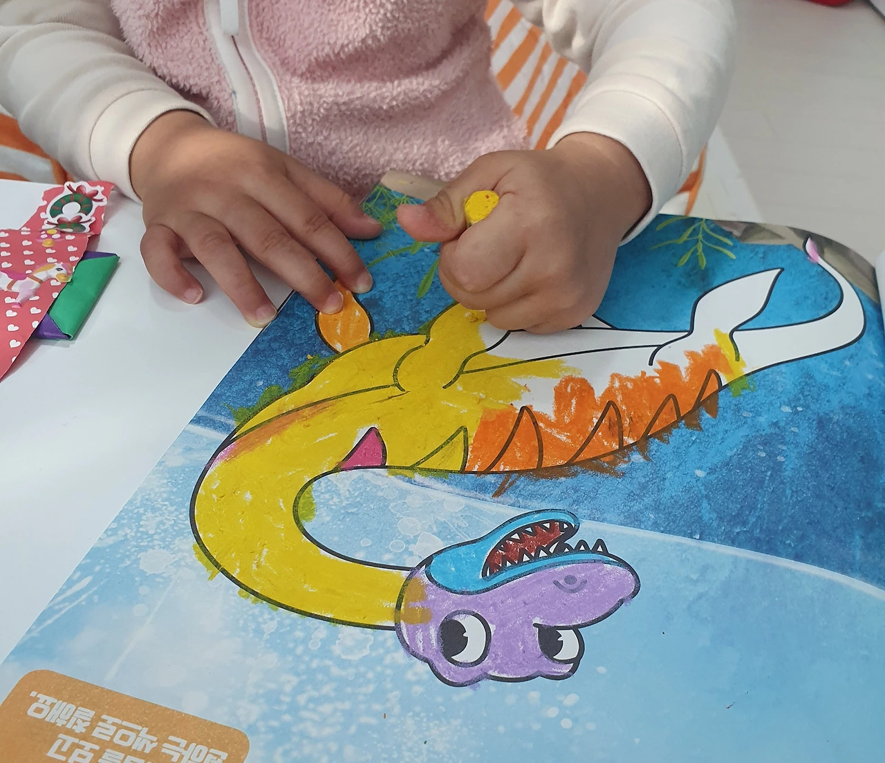 "Too big, 너무 커" 아이가 이번엔 친절히 도 색칠하던 공룡을 가리키며 설명을 곁들어 대답해 주었다.