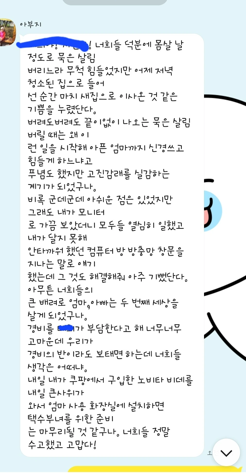 "우리 부모님 집이라고 생각하고 최선을 다 해 보겠습니다."라고 말씀해 주셔서 정말 감사했다.