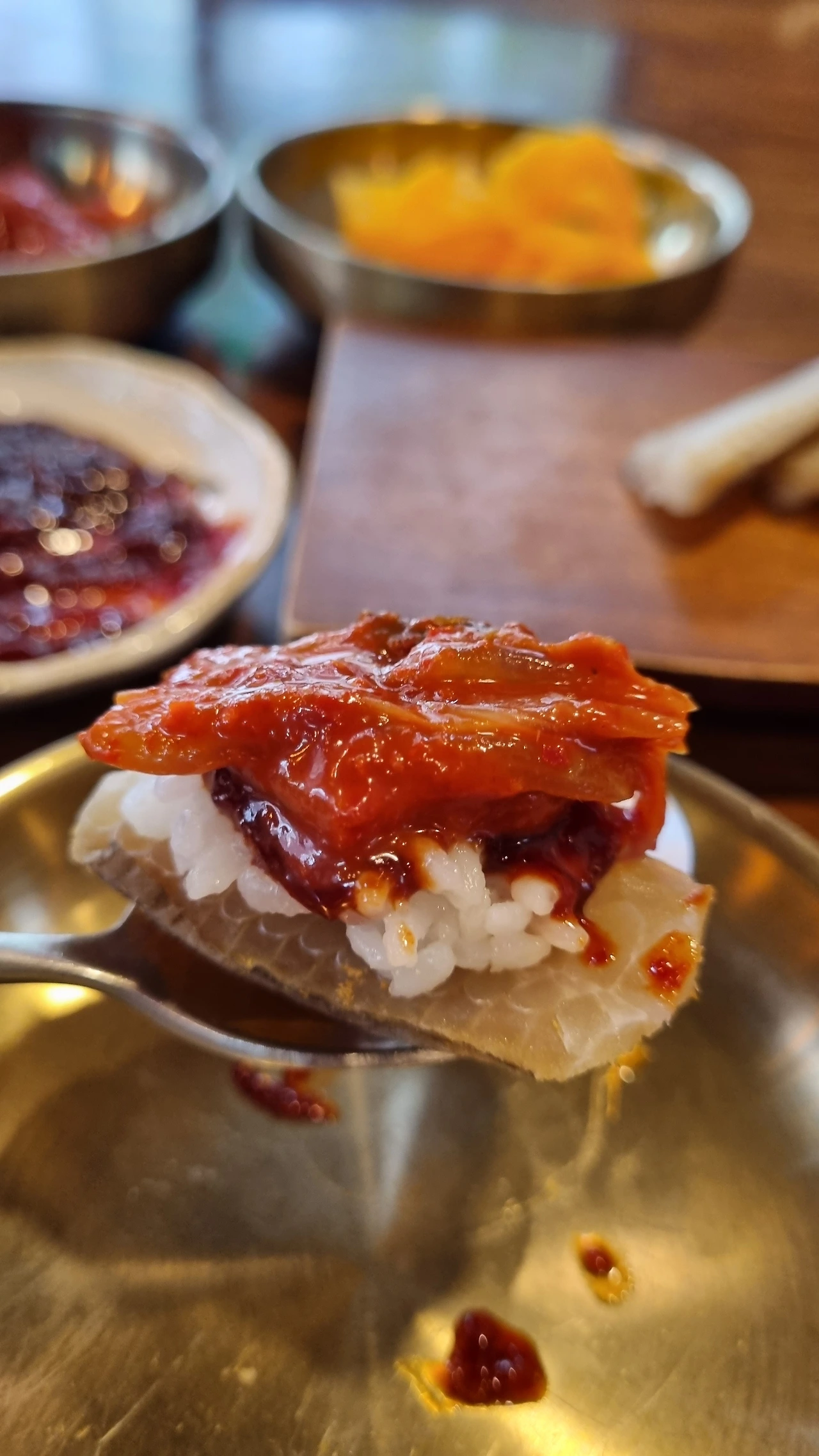 결론적으로 말하면 맛있었다. 상상이상이다. 그냥 먹어봐야 하는 그런 메뉴다. 하지만 가족들이랑 갈 수 없는(애들은 홍어를, 마누라는 개를 싫어하니...여기는 둘 다 있다) 나만 혼자 먹어도 별로 욕얻어 먹지 않을, 다음에도 기회가 되면 다시 들러서 먹어보고 싶은 묘한 음식이었다.