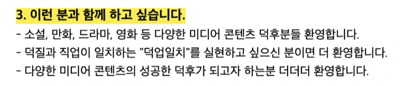 인턴이 정확히 무슨 포지션인지, 경쟁률은 어느 정도 되는지, 아무런 정보도 없던 나는 취업 카페에서 인턴 공고를 훑어보았고, 눈에 띄는 회사를 발견하였다. '카카오 엔터테인먼트'. 진행 중인 공고 중 가장 높은 조회 수를 기록하던 해당 회사는 '카카오페이지'와 '카카오 M', 그리고 '멜론'이 결합한 카카오의 엔터사업 결정체였다. 직무는 'IP 마케팅'으로 카카오의 다양한 영화, 웹툰, 웹소설 등 IP를 마케팅하는 팀이었다. 그리고 공고의 내용 중, 원하는 인재상에 관한 부분이 내 뇌리에 꽂혀 들어왔다. 나의 시선을 사로잡았던 한 줄, "덕질과 직업이 일치하는 ‘덕업 일치’를 실현하고 싶으신 분이면 더 환영합니다.". 덕. 업. 일. 치. 이것은 세상 모든 오타쿠들의 꿈일 것이다.