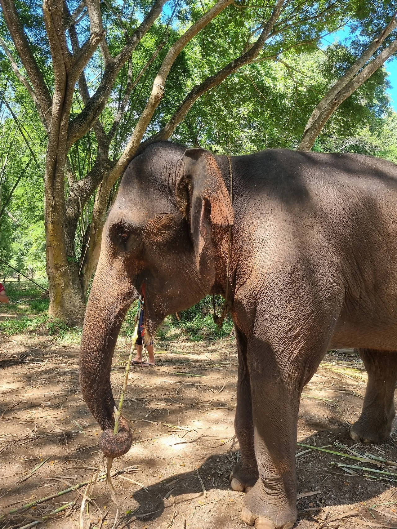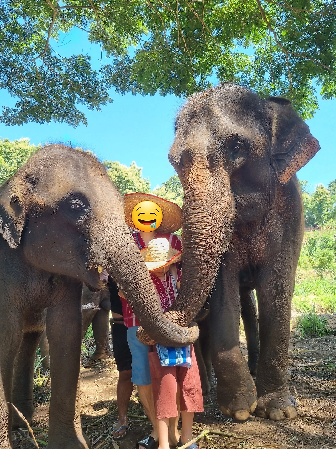 코끼리는 5마리가 있는데 체험 조별로 사람 수에 따라 2마리, 3마리로 나눠 배정한다.우리는 다른 관광객 없이 우리끼리 체험했다.간단히 코끼리와의 소통 방법을 배우고 본격적으로 코끼리에게 다가갔다.직접 간식을 주면서 친해지는데 바나나와 사탕수수가 두 바구니씩 제공된다.우리는 3살 정도 된 아기 코끼리와 엄마 코끼리를 만났다. 무섭다기보다 신기했다.
